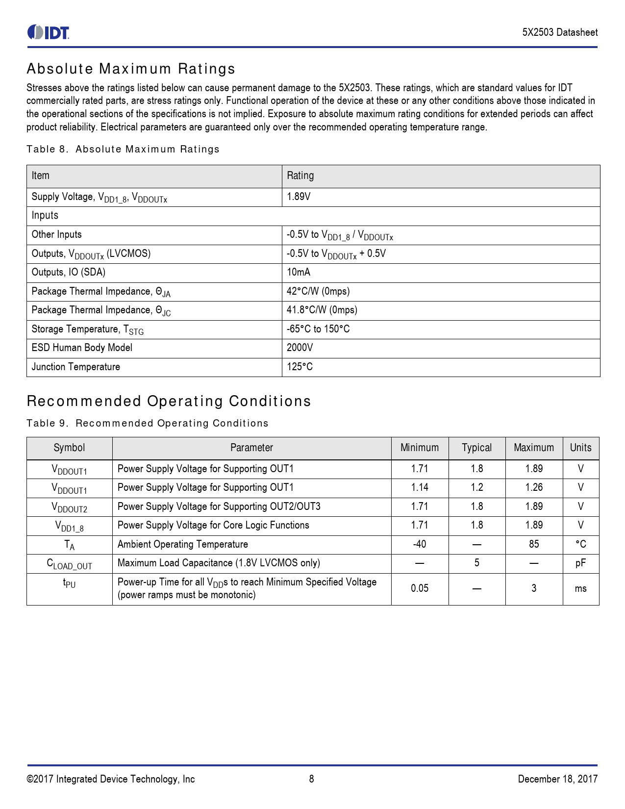 Stresses above the ratings listed below can cause permanent damage to the 5X2503. These ratings, which are standard values for IDT commercial y rated parts, are stress ratings only. Functional operation of the device at these or any other conditions above those indicated in the operational sections of the specifications is not implied. Exposure to absolute maximum rating conditions for extended periods can affect product reliability. Electrical parameters are guaranteed only over the recommended operating temperature range.