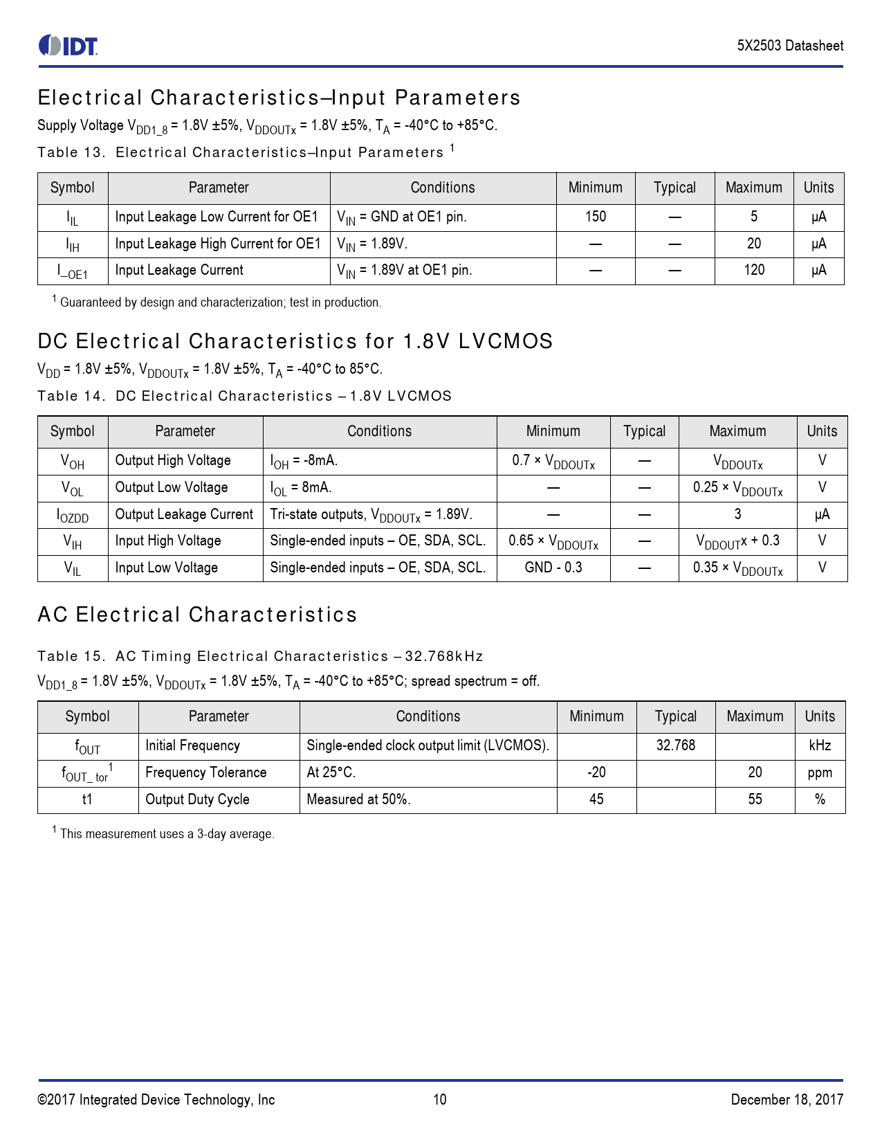 fOUT Initial Frequency Single-ended clock output limit (LVCMOS). 32.768 kHz f 1 OUT_ tor Frequency Tolerance At 25°C. -20 20 ppm t1 Output Duty Cycle Measured at 50%. 45 55 % 1 This measurement uses a 3-day average. ©2017 Integrated Device Technology, Inc 10 December 18, 2017 Document Outline Description Typical Applications Features Output Features Key Specifications Block Diagram Power Group Output Source Selection Register Setting Tables Pin Assignments Figure 1. Pin Assignments for 2.5 × 2.5 mm 12-DFN Package Pin Descriptions Table 1. Pin Descriptions Device Feature and Function DFC – Dynamic Frequency Control Figure 2. DFC Function Block Diagram Table 2. DFC Function Priority DFC Function Programming PPS – Proactive Power Saving Function Figure 3. PPS Function Block Diagram Figure 4. PPS Assertion/Deassertion Timing Chart PPS Function Programming Input Pin Function Table 3. OE1 Pin Function Table Table 4. SDA/SCL Function Selection Spread Spectrum ORT – VCO Overshoot Reduction Technology PLL Features and Descriptions Table 5. Output Divider 1 Table 6. Output Divider 2, 3, and 5 Table 7. Output Divider 4 Output Clock Test Conditions Figure 5. LVCMOS Output Clock Test Condition Absolute Maximum Ratings Table 8. Absolute Maximum Ratings Recommended Operating Conditions Table 9. Recommended Operating Conditions Input Capacitance, LVCMOS Output Impedance, and Internal Pull-down Resistance (TA = +25 °C) Table 10. Input Capacitance, LVCMOS Output Impedance, and Internal Pull-down Resistance Integrated Crystal Characteristics Table 11. Crystal Characteristics DC Electrical Characteristics Table 12. DC Electrical Characteristics 1,2 Electrical Characteristics–Input Parameters Table 13. Electrical Characteristics–Input Parameters 1 DC Electrical Characteristics for 1.8V LVCMOS Table 14. DC Electrical Characteristics – 1.8V LVCMOS AC Electrical Characteristics Table 15. AC Timing Electrical Characteristics – 32.768kHz Table 16. AC Timing Electrical Characteristics – 1.8V Table 17. AC Timing Electrical Characteristics, 1.2V / 1.8V I2C Bus DC Characteristics Table 18. I2C Bus DC Characteristics Table 19. I2C Bus AC Characteristics Spread Spectrum Generation Specifications Table 20. Spread Spectrum Generation Specifications General SMBus Serial Interface Information Package Outline Drawings Figure 6. NDG12 Package Drawing – page 1 Figure 7. NDG12 Package Drawing – page 2 Ordering Information Marking Diagram Revision History
