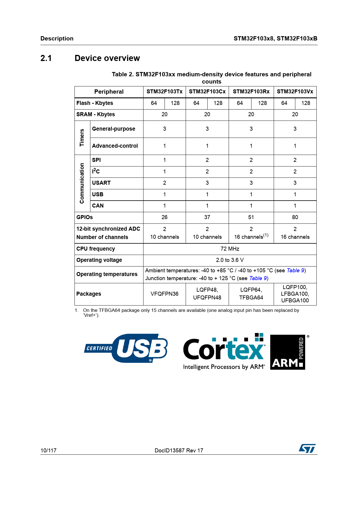 link to page 117 link to page 38 link to page 38 DescriptionSTM32F103x8, STM32F103xB2.1 DeviceoverviewTable 2. STM32F103xx medium-density device features and peripheralcountsPeripheralSTM32F103TxSTM32F103CxSTM32F103RxSTM32F103VxFlash - Kbytes 64 128 64 128 64 128 64 128 SRAM - Kbytes 20 20 20 20 ersGeneral-purpose 3 3 3 3 m TiAdvanced-control 1 1 1 1 SPI 1 2 2 2 ationI2C 1 2 2 2 unicUSART 2 3 3 3 mUSB 1 1 1 1 ComCAN 1 1 1 1 GPIOs 26 37 51 80 12-bit synchronized ADC 2 2 2 2 Number of channels 10 channels 10 channels 16 channels(1) 16 channels CPU frequency 72 MHz Operating voltage 2.0 to 3.6 V Ambient temperatures: -40 to +85 °C / -40 to +105 °C (see Table 9) Operating temperatures Junction temperature: -40 to + 125 °C (see Table 9) LQFP48, LQFP64, LQFP100, Packages VFQFPN36 LFBGA100, UFQFPN48 TFBGA64 UFBGA100 1. On the TFBGA64 package only 15 channels are available (one analog input pin has been replaced by ‘Vref+’). 10/117 DocID13587 Rev 17 Document Outline Table 1. Device summary 1 Introduction 2 Description 2.1 Device overview Table 2. STM32F103xx medium-density device features and peripheral counts Figure 1. STM32F103xx performance line block diagram Figure 2. Clock tree 2.2 Full compatibility throughout the family Table 3. STM32F103xx family 2.3 Overview 2.3.1 ARM® Cortex®-M3 core with embedded Flash and SRAM 2.3.2 Embedded Flash memory 2.3.3 CRC (cyclic redundancy check) calculation unit 2.3.4 Embedded SRAM 2.3.5 Nested vectored interrupt controller (NVIC) 2.3.6 External interrupt/event controller (EXTI) 2.3.7 Clocks and startup 2.3.8 Boot modes 2.3.9 Power supply schemes 2.3.10 Power supply supervisor 2.3.11 Voltage regulator 2.3.12 Low-power modes 2.3.13 DMA 2.3.14 RTC (real-time clock) and backup registers 2.3.15 Timers and watchdogs Table 4. Timer feature comparison 2.3.16 I²C bus 2.3.17 Universal synchronous/asynchronous receiver transmitter (USART) 2.3.18 Serial peripheral interface (SPI) 2.3.19 Controller area network (CAN) 2.3.20 Universal serial bus (USB) 2.3.21 GPIOs (general-purpose inputs/outputs) 2.3.22 ADC (analog-to-digital converter) 2.3.23 Temperature sensor 2.3.24 Serial wire JTAG debug port (SWJ-DP) 3 Pinouts and pin description Figure 3. STM32F103xx performance line LFBGA100 ballout Figure 4. STM32F103xx performance line LQFP100 pinout Figure 5. STM32F103xx performance line UFBGA100 pinout Figure 6. STM32F103xx performance line LQFP64 pinout Figure 7. STM32F103xx performance line TFBGA64 ballout Figure 8. STM32F103xx performance line LQFP48 pinout Figure 9. STM32F103xx performance line UFQFPN48 pinout Figure 10. STM32F103xx performance line VFQFPN36 pinout Table 5. Medium-density STM32F103xx pin definitions 4 Memory mapping Figure 11. Memory map 5 Electrical characteristics 5.1 Parameter conditions 5.1.1 Minimum and maximum values 5.1.2 Typical values 5.1.3 Typical curves 5.1.4 Loading capacitor 5.1.5 Pin input voltage Figure 12. Pin loading conditions Figure 13. Pin input voltage 5.1.6 Power supply scheme Figure 14. Power supply scheme 5.1.7 Current consumption measurement Figure 15. Current consumption measurement scheme 5.2 Absolute maximum ratings Table 6. Voltage characteristics Table 7. Current characteristics Table 8. Thermal characteristics 5.3 Operating conditions 5.3.1 General operating conditions Table 9. General operating conditions 5.3.2 Operating conditions at power-up / power-down Table 10. Operating conditions at power-up / power-down 5.3.3 Embedded reset and power control block characteristics Table 11. Embedded reset and power control block characteristics 5.3.4 Embedded reference voltage Table 12. Embedded internal reference voltage 5.3.5 Supply current characteristics Table 13. Maximum current consumption in Run mode, code with data processing running from Flash Table 14. Maximum current consumption in Run mode, code with data processing running from RAM Figure 16. Typical current consumption in Run mode versus frequency (at 3.6 V) - code with data processing running from RAM, peripherals enabled Figure 17. Typical current consumption in Run mode versus frequency (at 3.6 V) - code with data processing running from RAM, peripherals disabled Table 15. Maximum current consumption in Sleep mode, code running from Flash or RAM Table 16. Typical and maximum current consumptions in Stop and Standby modes Figure 18. Typical current consumption on VBAT with RTC on versus temperature at different VBAT values Figure 19. Typical current consumption in Stop mode with regulator in Run mode versus temperature at VDD = 3.3 V and 3.6 V Figure 20. Typical current consumption in Stop mode with regulator in Low-power mode versus temperature at VDD = 3.3 V and 3.6 V Figure 21. Typical current consumption in Standby mode versus temperature at VDD = 3.3 V and 3.6 V Table 17. Typical current consumption in Run mode, code with data processing running from Flash Table 18. Typical current consumption in Sleep mode, code running from Flash or RAM Table 19. Peripheral current consumption 5.3.6 External clock source characteristics Table 20. High-speed external user clock characteristics Table 21. Low-speed external user clock characteristics Figure 22. High-speed external clock source AC timing diagram Figure 23. Low-speed external clock source AC timing diagram Table 22. HSE 4-16 MHz oscillator characteristics Figure 24. Typical application with an 8 MHz crystal Table 23. LSE oscillator characteristics (fLSE = 32.768 kHz) Figure 25. Typical application with a 32.768 kHz crystal 5.3.7 Internal clock source characteristics Table 24. HSI oscillator characteristics Table 25. LSI oscillator characteristics Table 26. Low-power mode wakeup timings 5.3.8 PLL characteristics Table 27. PLL characteristics 5.3.9 Memory characteristics Table 28. Flash memory characteristics Table 29. Flash memory endurance and data retention 5.3.10 EMC characteristics Table 30. EMS characteristics Table 31. EMI characteristics 5.3.11 Absolute maximum ratings (electrical sensitivity) Table
