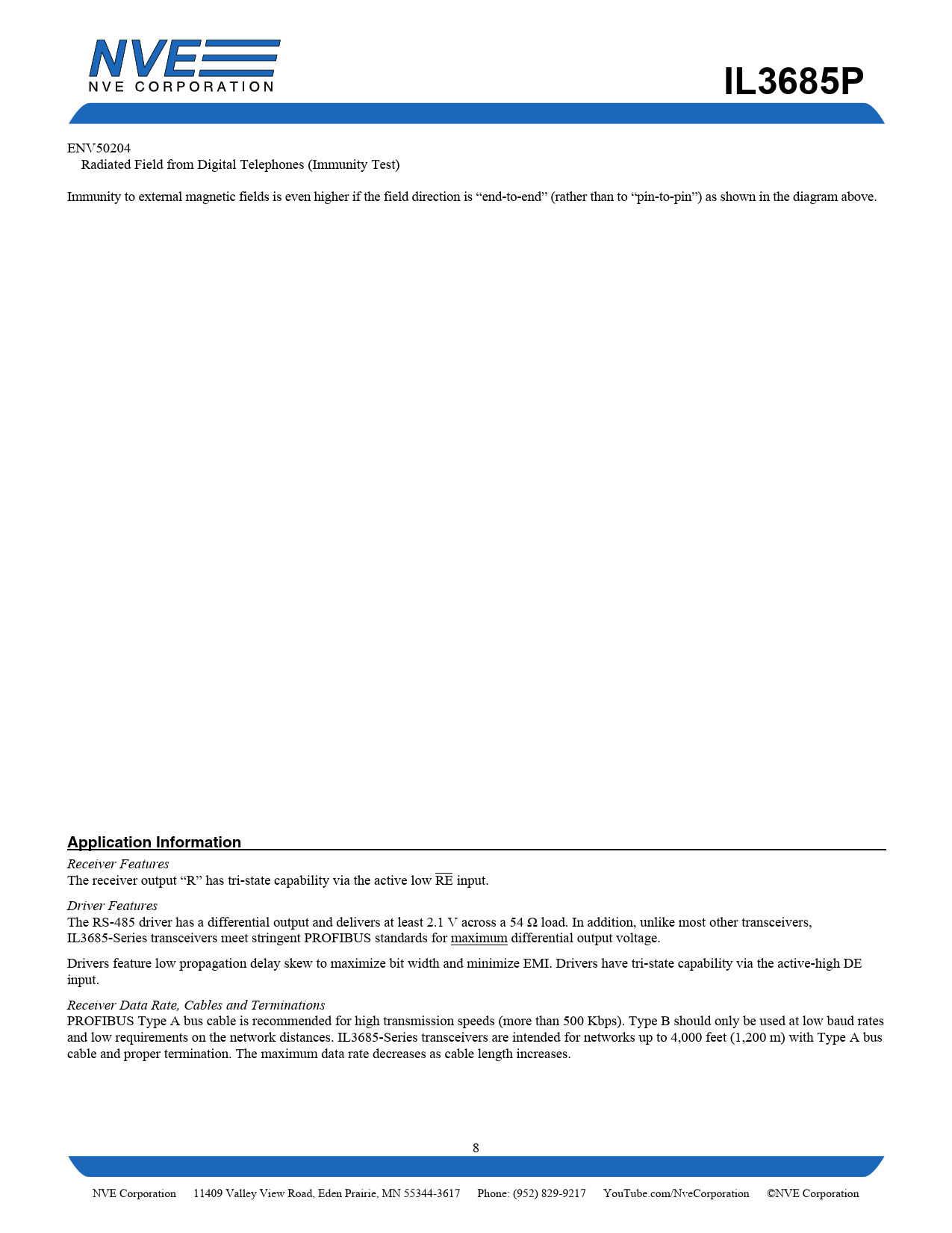 Receiver Features The receiver output “R” has tri-state capability via the active low RE input. Driver Features The RS-485 driver has a differential output and delivers at least 2.1 V across a 54 Ω load. In addition, unlike most other transceivers, IL3685-Series transceivers meet stringent PROFIBUS standards for maximum differential output voltage. Drivers feature low propagation delay skew to maximize bit width and minimize EMI. Drivers have tri-state capability via the active-high DE input. Receiver Data Rate, Cables and Terminations PROFIBUS Type A bus cable is recommended for high transmission speeds (more than 500 Kbps). Type B should only be used at low baud rates and low requirements on the network distances. IL3685-Series transceivers are intended for networks up to 4,000 feet (1,200 m) with Type A bus cable and proper termination. The maximum data rate decreases as cable length increases. 8 NVE Corporation 11409 Valley View Road, Eden Prairie, MN 55344-3617 Phone: (952) 829-9217 YouTube.com/NveCorporation ©NVE Corporation