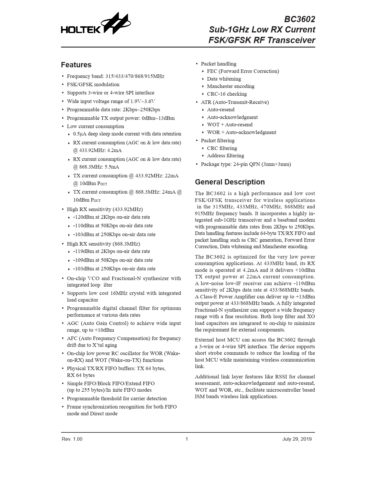 BC3602Sub-1GHz Low RX CurrentFSK/GFSK RF TransceiverFeatures • Packet handling ♦ FEC (Forward Error Correction) • Frequency band: 315/433/470/868/915MHz ♦ Data whitening • FSK/GFSK modulation ♦ Manchester encoding • Supports 3-wire or 4-wire SPI interface ♦ CRC-16 checking • Wide input voltage range of 1.9V~3.6V • ATR (Auto-Transmit-Receive) • Programmable data rate: 2Kbps~250Kbps ♦ Auto-resend • Programmable TX output power: 0dBm~13dBm ♦ Auto-acknowledgment • Low current consumption ♦ WOT + Auto-resend ♦ 0.5μA deep sleep mode current with data retention ♦ WOR + Auto-acknowledgment • Packet filtering ♦ RX current consumption (AGC on & low data rate) @ 433.92MHz: 4.2mA ♦ CRC filtering ♦ Address filtering ♦ RX current consumption (AGC on & low data rate) @ 868.3MHz: 5.5mA • Package type: 24-pin QFN (3mm×3mm) ♦ TX current consumption @ 433.92MHz: 22mA @ 10dBm POUT General Description ♦ TX current consumption @ 868.3MHz: 24mA @ The BC3602 is a high performance and low cost 10dBm POUT FSK/GFSK transceiver for wireless applications • High RX sensitivity (433.92MHz) in the 315MHz, 433MHz, 470MHz, 868MHz and 915MHz frequency bands. It incorporates a highly in- ♦ -120dBm at 2Kbps on-air data rate tegrated sub-1GHz transceiver and a baseband modem ♦ -110dBm at 50Kbps on-air data rate with programmable data rates from 2Kbps to 250Kbps. ♦ -103dBm at 250Kbps on-air data rate Data handling features include 64-byte TX/RX FIFO and packet handling such as CRC generation, Forward Error • High RX sensitivity (868.3MHz) Correction, Data whitening and Manchester encoding. ♦ -119dBm at 2Kbps on-air data rate The BC3602 is optimized for the very low power ♦ -109dBm at 50Kbps on-air data rate consumption applications. At 433MHz band, its RX ♦ -103dBm at 250Kbps on-air data rate mode is operated at 4.2mA and it delivers +10dBm • On-chip VCO and Fractional-N synthesizer with TX output power at 22mA current consumption. integrated loop ilter A low-noise low-IF receiver can achieve -119dBm • Supports low cost 16MHz crystal with integrated sensitivity of 2Kbps data rate at 433/868MHz bands. load capacitor A Class-E Power Amplifier can deliver up to +13dBm output power at 433/868MHz bands. A fully integrated • Programmable digital channel filter for optimum Fractional-N synthesizer can support a wide frequency performance at various data rates range with a fine resolution. Both loop filter and XO • AGC (Auto Gain Control) to achieve wide input load capacitors are integrared to on-chip to minimize range, up to +10dBm the requirement for external components. • AFC (Auto Frequency Compensation) for frequency External host MCU can access the BC3602 through drift due to X’tal aging a 3-wire or 4-wire SPI interface. The device supports • On-chip low power RC oscillator for WOR (Wake- short strobe commands to reduce the loading of the on-RX) and WOT (Wake-on-TX) functions host MCU while maintaining wireless communication • Physical TX/RX FIFO buffers: TX 64 bytes, link. RX 64 bytes Additional link layer features like RSSI for channel • Simple FIFO/Block FIFO/Extend FIFO assessment, auto-acknowledgement and auto-resend, (up to 255 bytes)/In inite FIFO modes WOT and WOR, etc., facilitate microcontroller based • Programmable threshold for carrier detection ISM bands wireless link applications. • Frame synchronization recognition for both FIFO mode and Direct mode Rev. 1.00 1 July 29, 2019 Rev. 1.00 PB July 29, 2019 Document Outline Features General Description Block Diagram Pin Assignment Pin Description Absolute Maximum Ratings D.C. Characteristics A.C. Characteristics Memory Mapping Control Register Access SFR Mapping and Bit Definition Common Area Control Register Bank 0 Control Registers Bank 1 Control Registers Bank 2 Control Registers Special Function Description Sub-1GHz RF Transceiver Serial Interface System Clock Frequency Synthesizer Modulator State Machine Calibration AGC & RSSI Packet Handler FIFO Operation Modes Receiving Packet Judgement Continuous RX Mode ARK Mode: Auto-Resend and Auto-Ack ATR Mode: Auto-Transmit-Receive Message Flowchart Examples Abbreviation Application Circuits Package Information SAW Type 24-pin QFN (3mm×3mm×0.55mm) Outline Dimensions