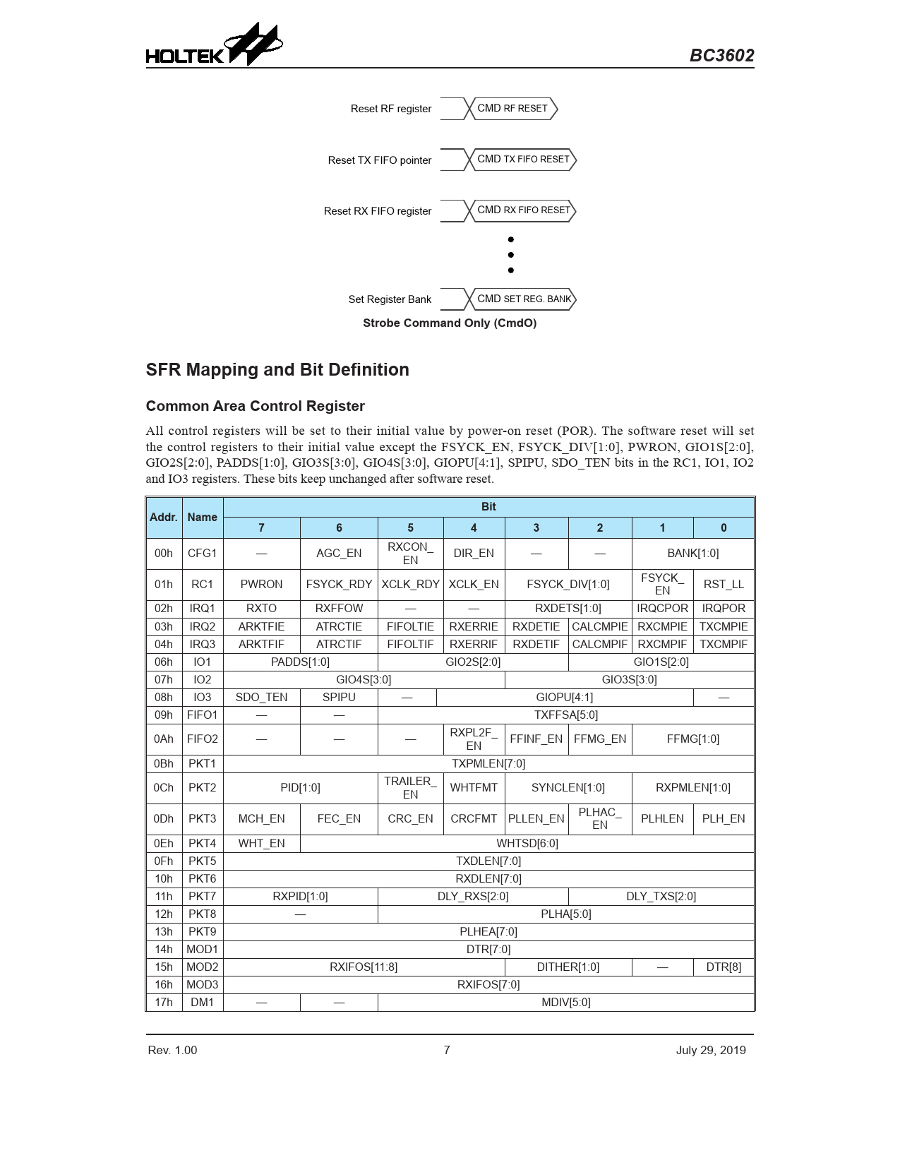 BC3602. Strobe Command Only (CmdO). SFR Mapping and Bit Definition. Common Area Control Register. Bit. Addr. Name