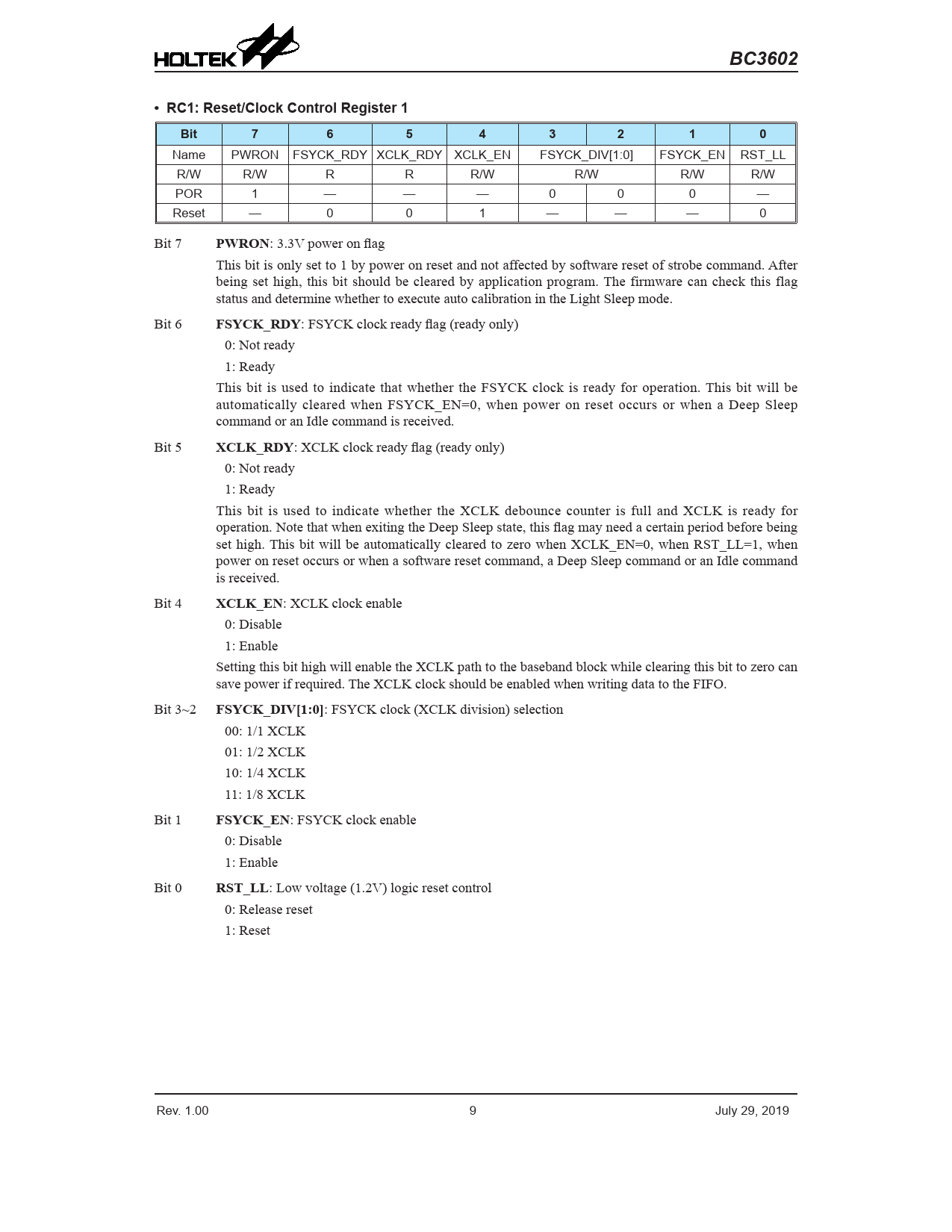BC3602. • RC1: Reset/Clock Control Register 1. Bit. PWRON. FSYCK_RDY. XCLK_RDY. XCLK_EN. FSYCK_DIV[1:0]. FSYCK_EN. RST_LL