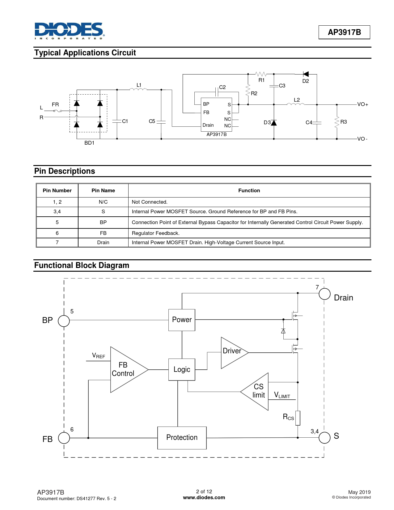 7 Drain 5 BP Power Driver VREF FB Logic Control CS limit VLIMIT RCS 6 3,4 Protection FB S AP3917B 2 of 12 May 2019 Document number: DS41277 Rev. 5 - 2