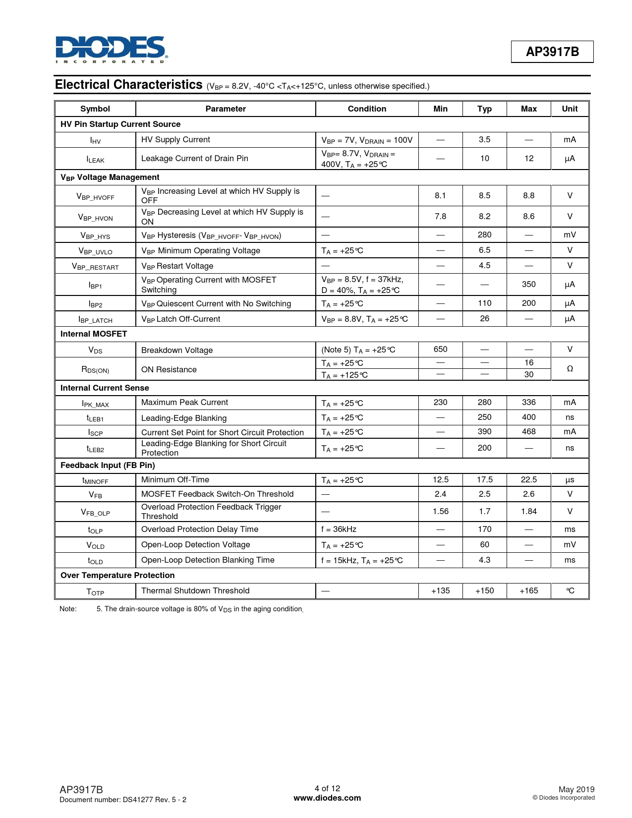 AP3917B. Electrical Characteristics. Symbol. Parameter. Condition. Min. Typ. Max. Unit. HV Pin Startup Current Source