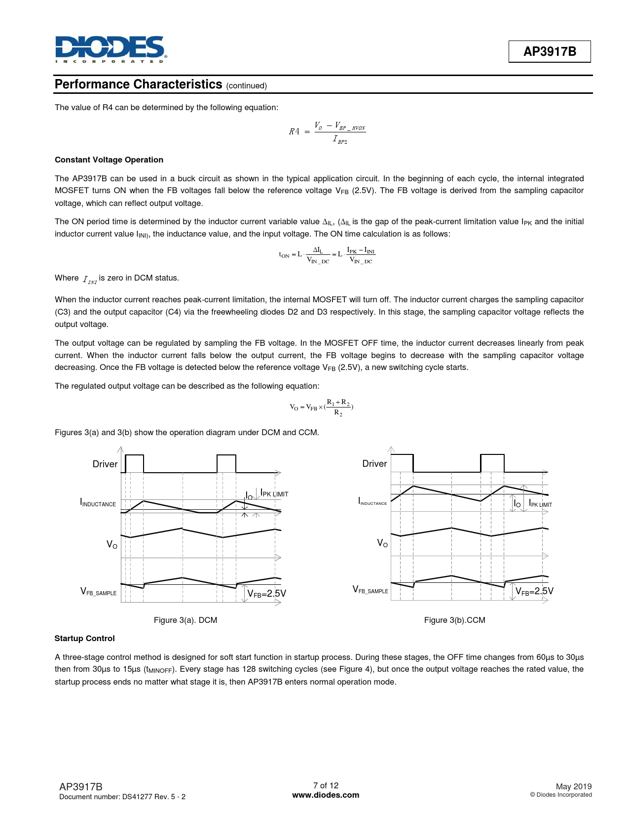 A three-stage control method is designed for soft start function in startup process. During these stages, the OFF time changes from 60µs to 30µs then from 30µs to 15µs (tMINOFF). Every stage has 128 switching cycles (see Figure 4), but once the output voltage reaches the rated value, the startup process ends no matter what stage it is, then AP3917B enters normal operation mode. AP3917B 7 of 12 May 2019 Document number: DS41277 Rev. 5 - 2