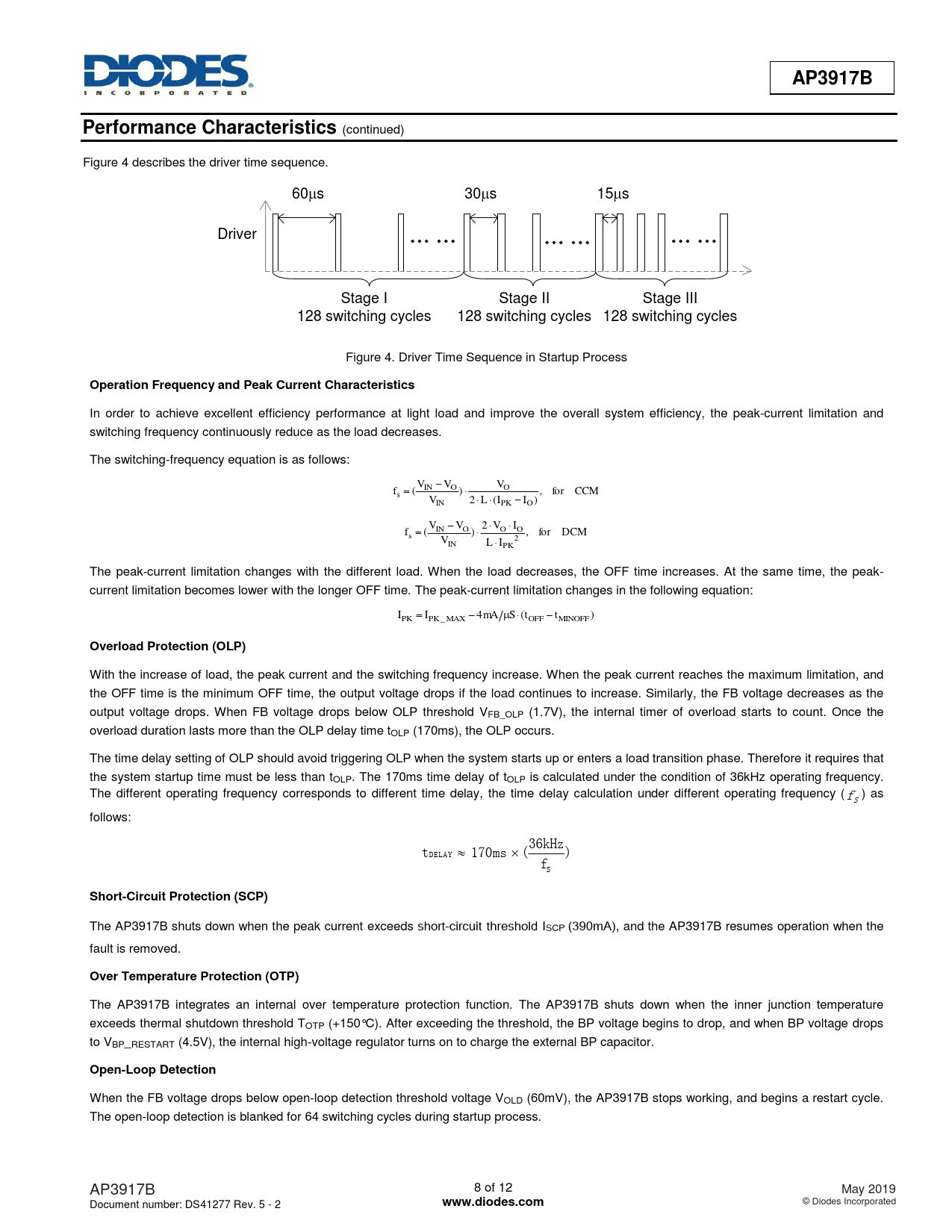 When the FB voltage drops below open-loop detection threshold voltage VOLD (60mV), the AP3917B stops working, and begins a restart cycle. The open-loop detection is blanked for 64 switching cycles during startup process. AP3917B 8 of 12 May 2019 Document number: DS41277 Rev. 5 - 2