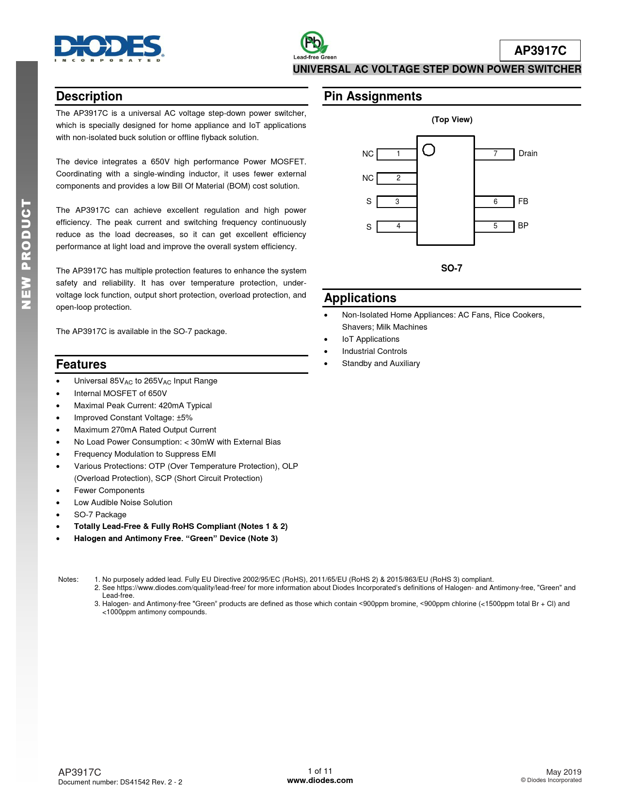 AP3917C. UNIVERSAL AC VOLTAGE STEP DOWN POWER SWITCHER. Description. Pin Assignments. (Top View). SO-7. Applications. Features