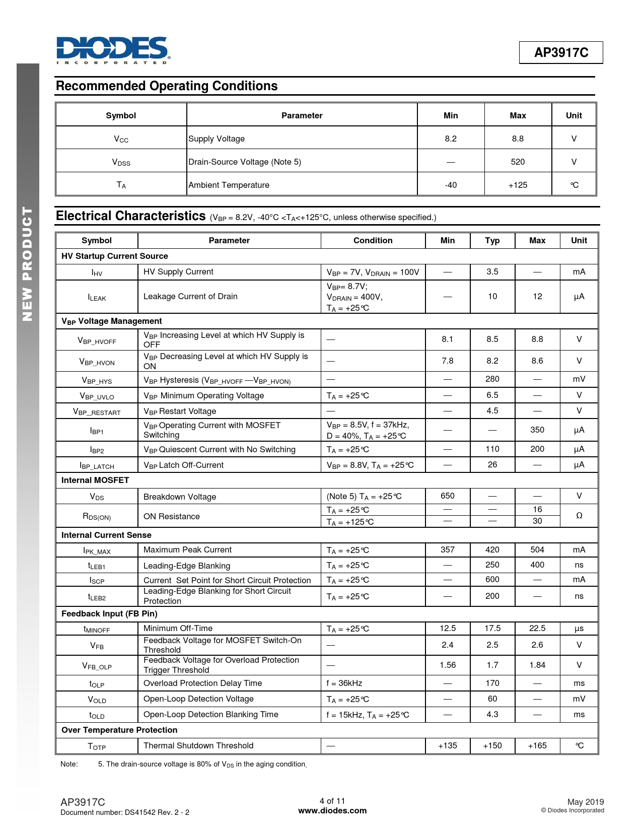 VCC Supply Voltage 8.2 8.8 V VDSS Drain-Source Voltage (Note 5) — 520 V TA Ambient Temperature -40 +125 °C
