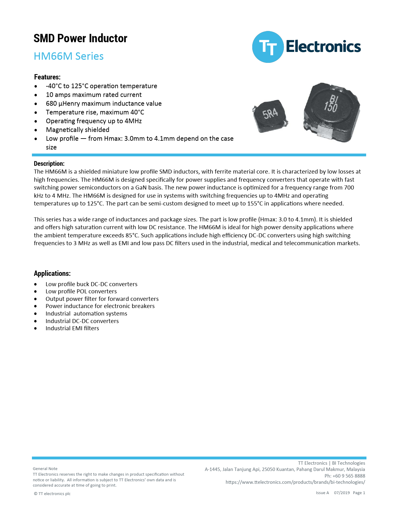 Low profile buck DC-DC converters Low profile POL converters Output power filter for forward converters Power inductance for electronic breakers Industrial automation systems Industrial DC-DC converters Industrial EMI filters TT Electronics | BI Technologies General Note A-1445, Jalan Tanjung Api, 25050 Kuantan, Pahang Darul Makmur, Malaysia TT Electronics reserves the right to make changes in product specification without Ph: +60 9 565 8888 notice or liability. All information is subject to TT Electronics’ own data and is https://www.ttelectronics.com/products/brands/bi-technologies/ considered accurate at time of going to print. © TT electronics plc Issue A 07/2019 Page 1