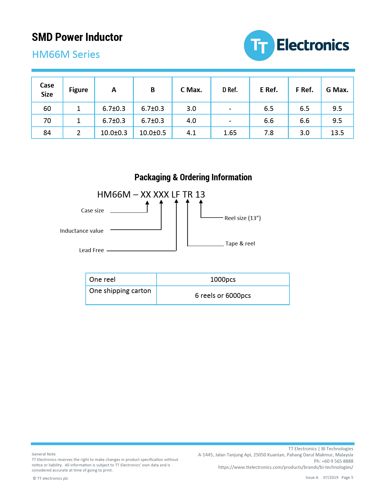 HM66M – XX XXX LF TR 13 Case size Reel size (13”) Inductance value Tape & reel Lead Free One reel 1000pcs One shipping carton 6 reels or 6000pcs TT Electronics | BI Technologies General Note A-1445, Jalan Tanjung Api, 25050 Kuantan, Pahang Darul Makmur, Malaysia TT Electronics reserves the right to make changes in product specification without Ph: +60 9 565 8888 notice or liability. All information is subject to TT Electronics’ own data and is https://www.ttelectronics.com/products/brands/bi-technologies/ considered accurate at time of going to print. © TT electronics plc Issue A 07/2019 Page 5