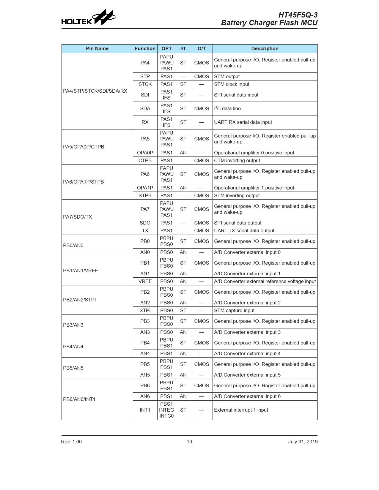 HT45F5Q-3 HT45F5Q-3 Battery Charger Flash MCU Battery Charger Flash MCU Pin Name Function OPT I/T O/T Description