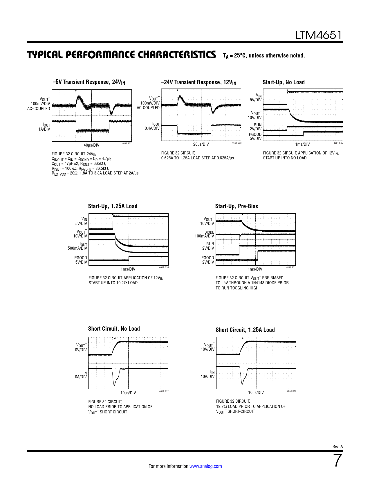 LTM4651 TYPICAL PERFORMANCE CHARACTERISTICS TA = 25°C, unless otherwise noted.–5V Transient Response, 24VIN–24V Transient Response, 12VINStart-Up, No Load V V – – IN OUT VOUT 5V/DIV 100mV/DIV 100mV/DIV AC-COUPLED AC-COUPLED V – OUT 10V/DIV IOUT IOUT RUN 1A/DIV 0.4A/DIV 2V/DIV PGOOD 5V/DIV 40μs/DIV 4651 G07 20μs/DIV 4651 G08 1ms/DIV 4651 G09 FIGURE 32 CIRCUIT, 24VIN, FIGURE 32 CIRCUIT, FIGURE 32 CIRCUIT, APPLICATION OF 12VIN, CINOUT = CIN = CDGND = CD = 4.7μF, 0.625A TO 1.25A LOAD STEP AT 0.625A/μs START-UP INTO NO LOAD COUT = 47μF ×2, RfSET = 665kΩ, RISET = 100kΩ, RPGDFB = 36.5kΩ, REXTVCC = 20Ω, 1.8A TO 3.8A LOAD STEP AT 2A/μs Start-Up, 1.25A LoadStart-Up, Pre-Bias V – IN VOUT 5V/DIV 10V/DIV V – OUT IDIODE 10V/DIV 100mA/DIV IOUT RUN 500mA/DIV 2V/DIV PGOOD PGOOD 5V/DIV 2V/DIV 1ms/DIV 4651 G10 1ms/DIV 4651 G11 FIGURE 32 CIRCUIT, APPLICATION OF 12V – IN, FIGURE 32 CIRCUIT, VOUT PRE-BIASED START-UP INTO 19.2Ω LOAD TO –5V THROUGH A 1N4148 DIODE PRIOR TO RUN TOGGLING HIGH Short Circuit, No LoadShort Circuit, 1.25A Load V – – OUT VOUT 10V/DIV 10V/DIV IIN IIN 10A/DIV 10A/DIV 10μs/DIV 4651 G12 10μs/DIV 4651 G13 FIGURE 32 CIRCUIT, FIGURE 32 CIRCUIT, NO LOAD PRIOR TO APPLICATION OF 19.2Ω LOAD PRIOR TO APPLICATION OF V – – OUT SHORT-CIRCUIT VOUT SHORT-CIRCUIT Rev. A For more information www.analog.com 7 Document Outline Features Applications Typical Application Description Absolute Maximum Ratings Order Information Pin Configuration Electrical Characteristics Typical Performance Characteristics Pin Functions Simplified Block Diagram Test Circuit Decoupling Requirements Operation Applications Information Typical Applications Package Photograph Package Description Typical Application Related Parts