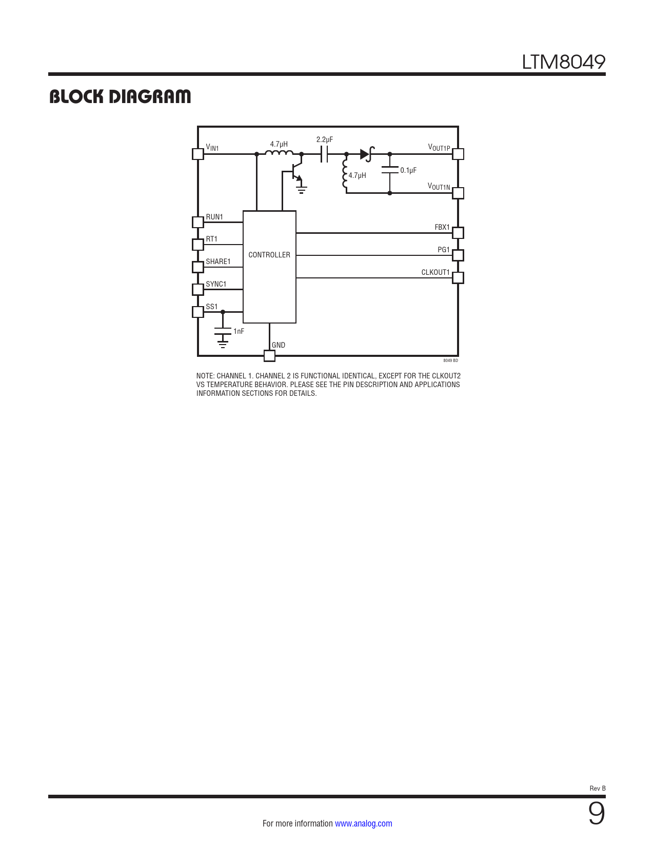 2.2µF V 4.7µH IN1 VOUT1P 0.1µF 4.7µH VOUT1N RUN1 FBX1 RT1 PG1 CONTROLLER SHARE1 CLKOUT1 SYNC1 SS1 1nF GND 8049 BD NOTE: CHANNEL 1. CHANNEL 2 IS FUNCTIONAL IDENTICAL, EXCEPT FOR THE CLKOUT2 VS TEMPERATURE BEHAVIOR. PLEASE SEE THE PIN DESCRIPTION AND APPLICATIONS INFORMATION SECTIONS FOR DETAILS. Rev B For more information www.analog.com 9 Document Outline Features Applications Typical Application Description Absolute Maximum Ratings Order Information Pin Configuration Electrical Characteristics Typical Performance Characteristics Pin Functions Block Diagram Operation Applications Information Typical Applications Package Description Package Photo Revision History Typical Application Related Parts