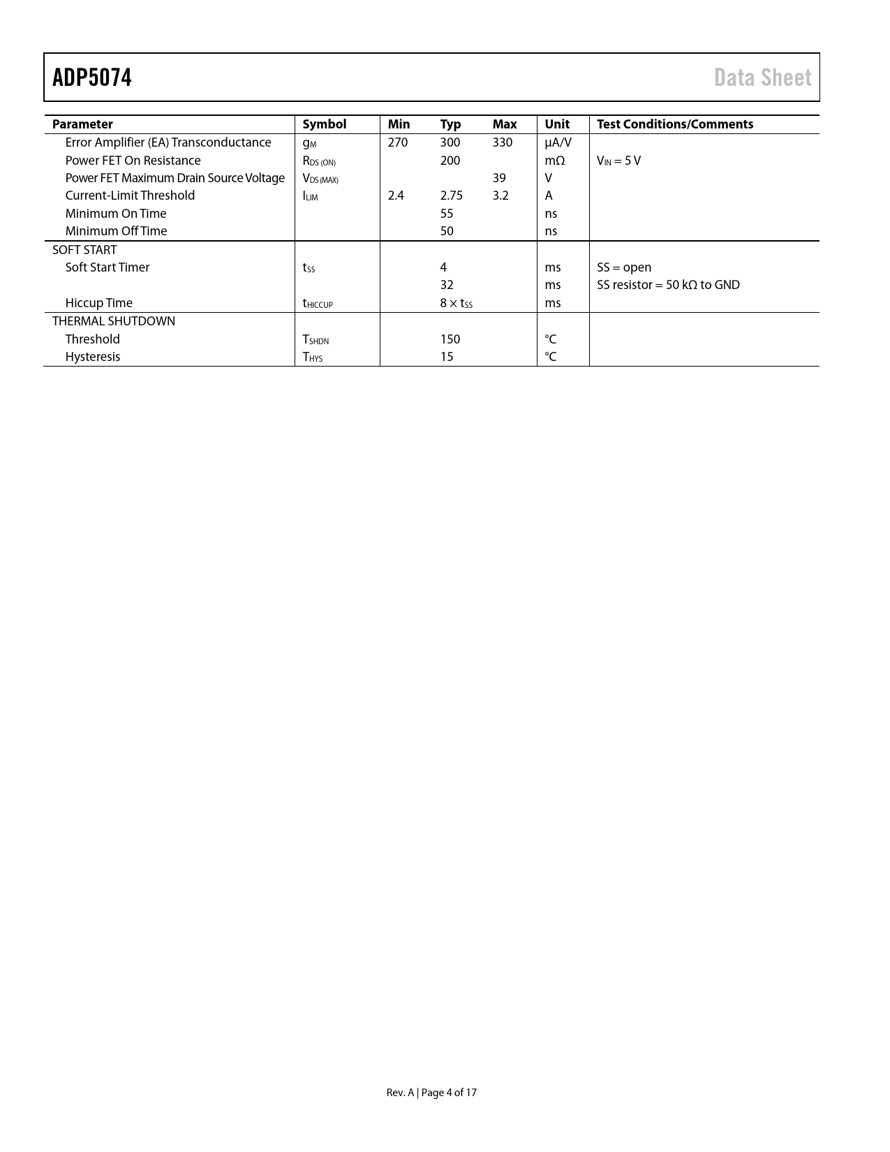 Pages / Page17 / 4 — ADP5074. Data Sheet. Parameter. Symbol. Min. Typ. Max. Unit. Test …