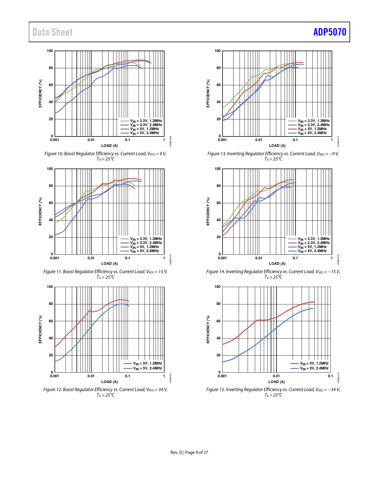 12068- Figure 10. Boost Regulator Efficiency vs. Current Load, VPOS = 9 V, Figure 13. Inverting Regulator Efficiency vs. Current Load, VNEG = −9 V, TA = 25°C TA = 25°C