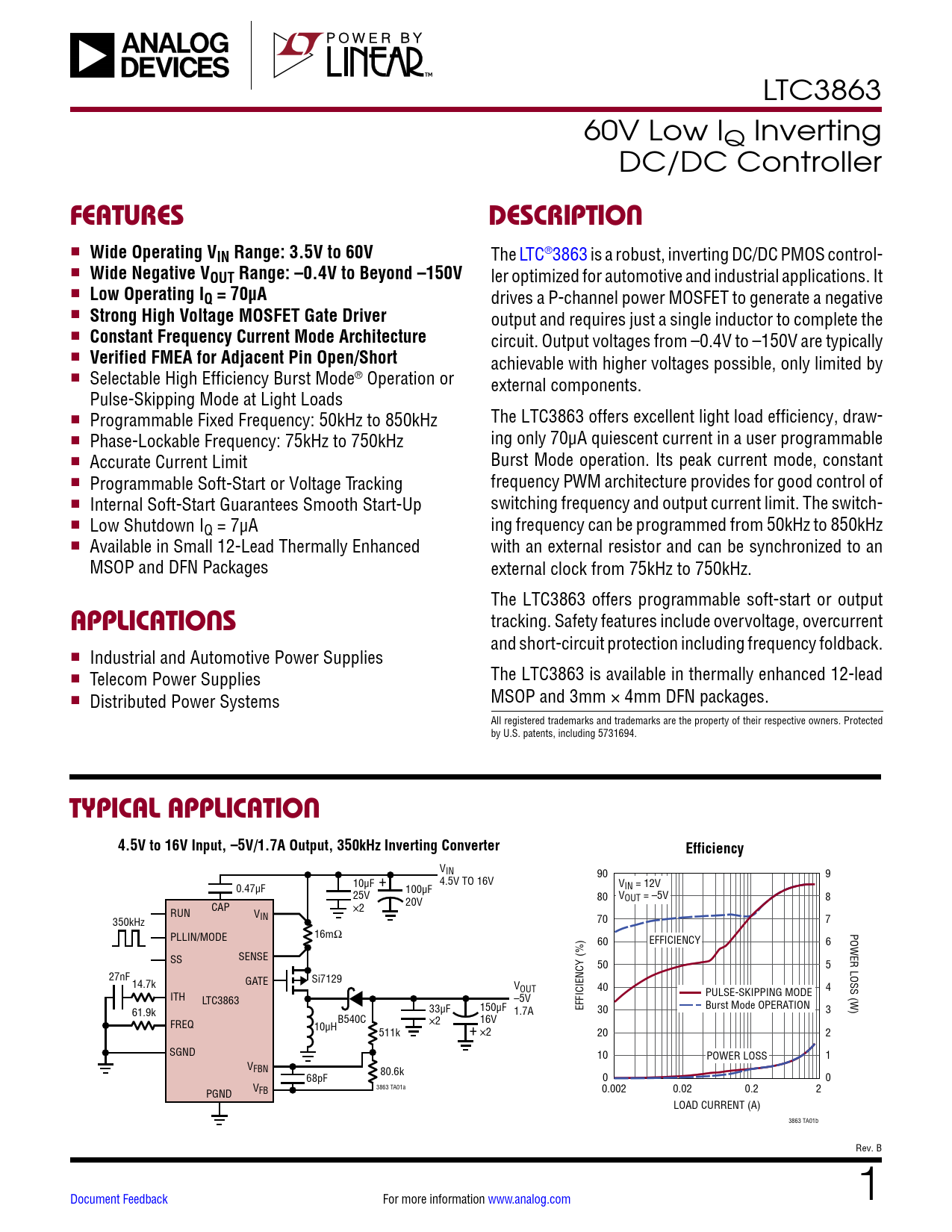 LTC3863 60V Low IQ Inverting DC/DC Controller FEATURESDESCRIPTION n Wide Operating VIN Range: 3.5V to 60V The LTC®3863 is a robust, inverting DC/DC PMOS control- n Wide Negative VOUT Range: –0.4V to Beyond –150V ler optimized for automotive and industrial applications. It n Low Operating IQ = 70µA drives a P-channel power MOSFET to generate a negative n Strong High Voltage MOSFET Gate Driver output and requires just a single inductor to complete the n Constant Frequency Current Mode Architecture circuit. Output voltages from –0.4V to –150V are typically n Verified FMEA for Adjacent Pin Open/Short achievable with higher voltages possible, only limited by n Selectable High Efficiency Burst Mode® Operation or external components. Pulse-Skipping Mode at Light Loads n Programmable Fixed Frequency: 50kHz to 850kHz The LTC3863 offers excellent light load efficiency, draw- n Phase-Lockable Frequency: 75kHz to 750kHz ing only 70μA quiescent current in a user programmable n Accurate Current Limit Burst Mode operation. Its peak current mode, constant n Programmable Soft-Start or Voltage Tracking frequency PWM architecture provides for good control of n Internal Soft-Start Guarantees Smooth Start-Up switching frequency and output current limit. The switch- n Low Shutdown IQ = 7µA ing frequency can be programmed from 50kHz to 850kHz n Available in Small 12-Lead Thermally Enhanced with an external resistor and can be synchronized to an MSOP and DFN Packages external clock from 75kHz to 750kHz. The LTC3863 offers programmable soft-start or output APPLICATIONS tracking. Safety features include overvoltage, overcurrent and short-circuit protection including frequency foldback. n Industrial and Automotive Power Supplies n The LTC3863 is available in thermally enhanced 12-lead Telecom Power Supplies n MSOP and 3mm Distributed Power Systems × 4mm DFN packages. All registered trademarks and trademarks are the property of their respective owners. Protected by U.S. patents, including 5731694. TYPICAL APPLICATION4.5V to 16V Input, –5V/1.7A Output, 350kHz Inverting ConverterEfficiency VIN + 90 9 4.5V TO 16V 0.47µF 10µF VIN = 12V 25V 100µF 80 VOUT = –5V 8 CAP ×2 20V RUN V 350kHz IN 70 7 16mΩ POWER LOSS (W) PLLIN/MODE 60 EFFICIENCY 6 SS SENSE 50 5 27nF GATE Si7129 14.7k VOUT 40 4 ITH PULSE-SKIPPING MODE LTC3863 –5V Burst Mode OPERATION 61.9k 33µF 150µF 1.7A EFFICIENCY (%) 30 3 B540C FREQ 16V 10µH ×2 + 511k ×2 20 2 SGND 10 POWER LOSS 1 VFBN 80.6k 68pF 0 0 PGND 3863 TA01a VFB 0.002 0.02 0.2 2 LOAD CURRENT (A) 3863 TA01b Rev. B Document Feedback For more information www.analog.com 1 Document Outline Features Applications Typical Application Description Absolute Maximum Ratings Pin Configuration Order Information Electrical Characteristics Typical Performance Characteristics Pin Functions Functional Diagram Operation Applications Information Typical Applications Package Description Revision History Typical Application Related Parts