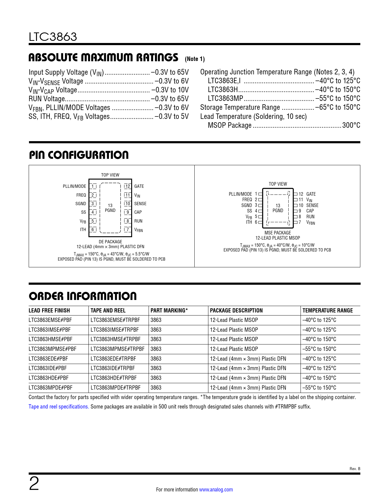 LTC3863EMSE#PBF LTC3863EMSE#TRPBF 3863 12-Lead Plastic MSOP –40°C to 125°C LTC3863IMSE#PBF LTC3863IMSE#TRPBF 3863 12-Lead Plastic MSOP –40°C to 125°C LTC3863HMSE#PBF LTC3863HMSE#TRPBF 3863 12-Lead Plastic MSOP –40°C to 150°C LTC3863MPMSE#PBF LTC3863MPMSE#TRPBF 3863 12-Lead Plastic MSOP –55°C to 150°C LTC3863EDE#PBF LTC3863EDE#TRPBF 3863 12-Lead (4mm × 3mm) Plastic DFN –40°C to 125°C LTC3863IDE#PBF LTC3863IDE#TRPBF 3863 12-Lead (4mm × 3mm) Plastic DFN –40°C to 125°C LTC3863HDE#PBF LTC3863HDE#TRPBF 3863 12-Lead (4mm × 3mm) Plastic DFN –40°C to 150°C LTC3863MPDE#PBF LTC3863MPDE#TRPBF 3863 12-Lead (4mm × 3mm) Plastic DFN –55°C to 150°C Contact the factory for parts specified with wider operating temperature ranges. *The temperature grade is identified by a label on the shipping container. Tape and reel specifications. Some packages are available in 500 unit reels through designated sales channels with #TRMPBF suffix. Rev. B 2 For more information www.analog.com Document Outline Features Applications Typical Application Description Absolute Maximum Ratings Pin Configuration Order Information Electrical Characteristics Typical Performance Characteristics Pin Functions Functional Diagram Operation Applications Information Typical Applications Package Description Revision History Typical Application Related Parts