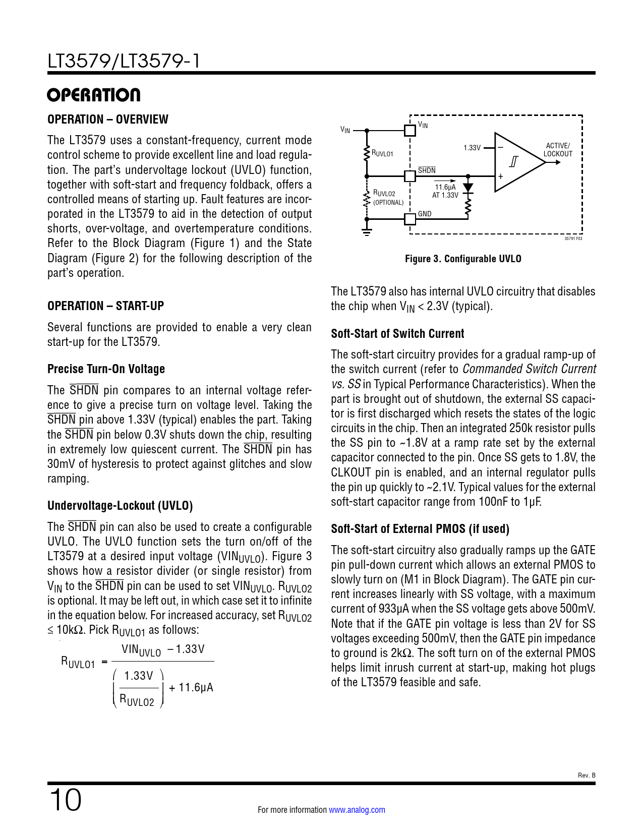 link to page 8 link to page 8 link to page 9 link to page 10 link to page 5 link to page 8 LT3579/LT3579-1 OPERATIONOPERATION – OVERVIEW VIN VIN The LT3579 uses a constant-frequency, current mode ACTIVE/ control scheme to provide excellent line and load regula- 1.33V – RUVLO1 LOCKOUT tion. The part’s undervoltage lockout (UVLO) function, SHDN + together with soft-start and frequency foldback, offers a 11.6µA controlled means of starting up. Fault features are incor- RUVLO2 AT 1.33V (OPTIONAL) porated in the LT3579 to aid in the detection of output GND shorts, over-voltage, and overtemperature conditions. Refer to the Block Diagram (Figure 1) and the State 35791 F03 Diagram (Figure 2) for the following description of the Figure 3. Configurable UVLO part’s operation. The LT3579 also has internal UVLO circuitry that disables OPERATION – START-UP the chip when VIN < 2.3V (typical). Several functions are provided to enable a very clean Soft-Start of Switch Current start-up for the LT3579. The soft-start circuitry provides for a gradual ramp-up of Precise Turn-On Voltage the switch current (refer to Commanded Switch Current The SHDN pin compares to an internal voltage refer- vs. SS in Typical Performance Characteristics). When the ence to give a precise turn on voltage level. Taking the part is brought out of shutdown, the external SS capaci- SHDN pin above 1.33V (typical) enables the part. Taking tor is first discharged which resets the states of the logic the SHDN pin below 0.3V shuts down the chip, resulting circuits in the chip. Then an integrated 250k resistor pulls in extremely low quiescent current. The SHDN pin has the SS pin to ~1.8V at a ramp rate set by the external 30mV of hysteresis to protect against glitches and slow capacitor connected to the pin. Once SS gets to 1.8V, the ramping. CLKOUT pin is enabled, and an internal regulator pul s the pin up quickly to ~2.1V. Typical values for the external Undervoltage-Lockout (UVLO) soft-start capacitor range from 100nF to 1μF. The SHDN pin can also be used to create a configurable Soft-Start of External PMOS (if used) UVLO. The UVLO function sets the turn on/off of the LT3579 at a desired input voltage (VIN The soft-start circuitry also gradually ramps up the GATE UVLO). Figure 3 shows how a resistor divider (or single resistor) from pin pull-down current which allows an external PMOS to V slowly turn on (M1 in Block Diagram). The GATE pin cur- IN to the SHDN pin can be used to set VINUVLO. RUVLO2 is optional. It may be left out, in which case set it to infinite rent increases linearly with SS voltage, with a maximum in the equation below. For increased accuracy, set R current of 933µA when the SS voltage gets above 500mV. UVLO2 ≤ 10kΩ. Pick R Note that if the GATE pin voltage is less than 2V for SS UVLO1 as follows: voltages exceeding 500mV, then the GATE pin impedance VINUVLO – 1.33V to ground is 2kΩ. The soft turn on of the external PMOS R UVLO1 = helps limit inrush current at start-up, making hot plugs ⎛ 1.33V ⎞ of the LT3579 feasible and safe. ⎜ ⎟ + 11.6µA ⎜ R ⎟ ⎝ UVLO2 ⎠ Rev. B 10 For more information www.analog.com Document Outline Features Applications Description Typical Application Absolute Maximum Ratings Pin Configuration Order Information Electrical Characteristics Typical Performance Characteristics Pin Functions Block Diagram State Diagram Operation Applications Information Appendix Typical Application Package Description Typical Application Related Parts Features Applications Typical Application Description Absolute Maximum Ratings Pin Configuration Order Information Electrical Characteristics Typical Performance Characteristics Pin Functions Block Diagram State Diagram Operation Applications Information Appendix Typical Application Package Description Revision History Typical Application Related Parts
