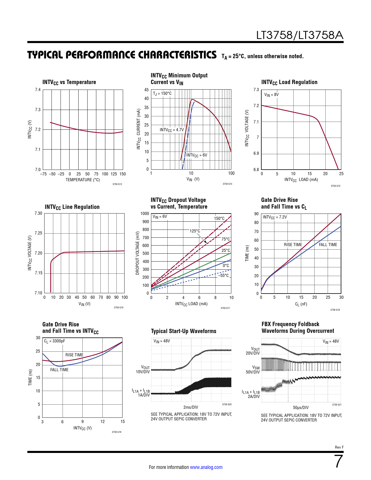 7.30 1000 90 VIN = 6V 150°C INTVCC = 7.2V 900 80 800 7.25 125°C 70 700 75°C 60 600 RISE TIME FALL TIME TAGE (V) TAGE (mV) 50 7.20 25°C 500 VOL TIME (ns) 40 V CC 400 0°C INT 300 30 7.15 DROPOUT VOL 200 –55°C 20 100 10 7.10 0 0 0 10 20 30 40 50 60 70 80 90 100 0 2 4 6 8 10 0 5 10 15 20 25 30 VIN (V) INTVCC LOAD (mA) CL (nF) 3758 G16 3758 G17 3758 G18