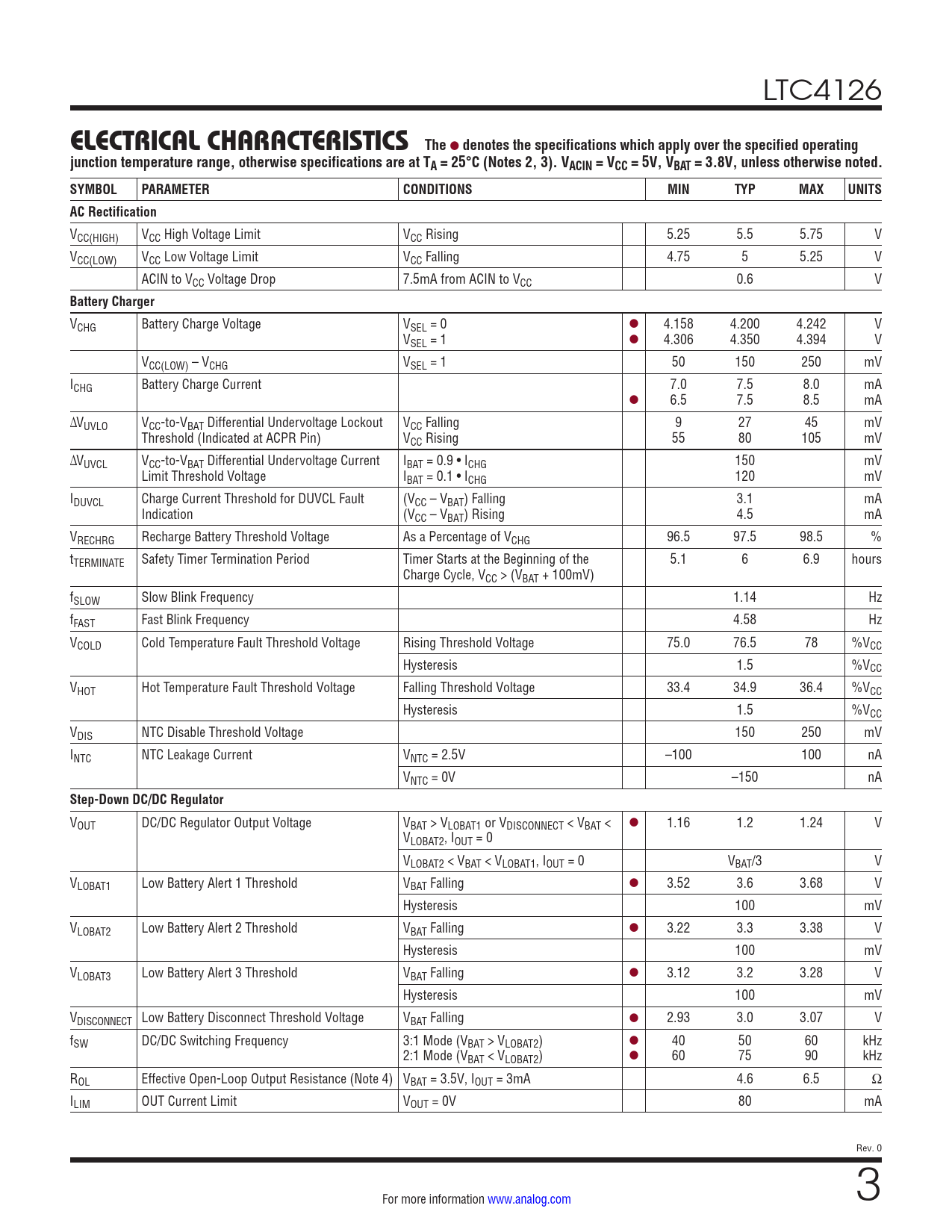 VCHG Battery Charge Voltage VSEL = 0 l 4.158 4.200 4.242 V VSEL = 1 l 4.306 4.350 4.394 V VCC(LOW) – VCHG VSEL = 1 50 150 250 mV ICHG Battery Charge Current 7.0 7.5 8.0 mA l 6.5 7.5 8.5 mA ΔVUVLO VCC-to-VBAT Differential Undervoltage Lockout VCC Falling 9 27 45 mV Threshold (Indicated at ACPR Pin) VCC Rising 55 80 105 mV ΔVUVCL VCC-to-VBAT Differential Undervoltage Current IBAT = 0.9 • ICHG 150 mV Limit Threshold Voltage IBAT = 0.1 • ICHG 120 mV IDUVCL Charge Current Threshold for DUVCL Fault (VCC – VBAT) Falling 3.1 mA Indication (VCC – VBAT) Rising 4.5 mA VRECHRG Recharge Battery Threshold Voltage As a Percentage of VCHG 96.5 97.5 98.5 % tTERMINATE Safety Timer Termination Period Timer Starts at the Beginning of the 5.1 6 6.9 hours Charge Cycle, VCC > (VBAT + 100mV) fSLOW Slow Blink Frequency 1.14 Hz fFAST Fast Blink Frequency 4.58 Hz VCOLD Cold Temperature Fault Threshold Voltage Rising Threshold Voltage 75.0 76.5 78 %VCC Hysteresis 1.5 %VCC VHOT Hot Temperature Fault Threshold Voltage Falling Threshold Voltage 33.4 34.9 36.4 %VCC Hysteresis 1.5 %VCC VDIS NTC Disable Threshold Voltage 150 250 mV INTC NTC Leakage Current VNTC = 2.5V –100 100 nA VNTC = 0V –150 nA