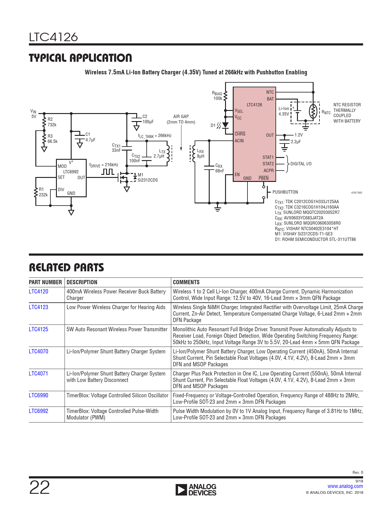 LTC4120 400mA Wireless Power Receiver Buck Battery Wireless 1 to 2 Cell Li-Ion Charger, 400mA Charge Current, Dynamic Harmonization Charger Control, Wide Input Range: 12.5V to 40V, 16-Lead 3mm × 3mm QFN Package LTC4123 Low Power Wireless Charger for Hearing Aids Wireless Single NiMH Charger, Integrated Rectifier with Overvoltage Limit, 25mA Charge Current, Zn-Air Detect, Temperature Compensated Charge Voltage, 6-Lead 2mm × 2mm DFN Package LTC4125 5W Auto Resonant Wireless Power Transmitter Monolithic Auto Resonant Full Bridge Driver. Transmit Power Automatically Adjusts to Receiver Load, Foreign Object Detection, Wide Operating Switching Frequency Range: 50kHz to 250kHz, Input Voltage Range 3V to 5.5V, 20-Lead 4mm × 5mm QFN Package LTC4070 Li-Ion/Polymer Shunt Battery Charger System Li-Ion/Polymer Shunt Battery Charger, Low Operating Current (450nA), 50mA Internal Shunt Current, Pin Selectable Float Voltages (4.0V, 4.1V, 4.2V), 8-Lead 2mm × 3mm DFN and MSOP Packages LTC4071 Li-Ion/Polymer Shunt Battery Charger System Charger Plus Pack Protection in One IC, Low Operating Current (550nA), 50mA Internal with Low Battery Disconnect Shunt Current, Pin Selectable Float Voltages (4.0V, 4.1V, 4.2V), 8-Lead 2mm × 3mm DFN and MSOP Packages LTC6990 TimerBlox: Voltage Controlled Silicon Oscillator Fixed-Frequency or Voltage-Controlled Operation, Frequency Range of 488Hz to 2MHz, Low-Profile SOT-23 and 2mm × 3mm DFN Packages LTC6992 TimerBlox: Voltage Controlled Pulse-Width Pulse Width Modulation by 0V to 1V Analog Input, Frequency Range of 3.81Hz to 1MHz, Modulator (PWM) Low-Profile SOT-23 and 2mm × 3mm DFN Packages Rev. 0 22 9/18 www.analog.com For more information www.analog.com ANALOG DEVICES, INC. 2018 Document Outline Features Applications Typical Application Description Absolute Maximum Ratings Order Information Electrical Characteristics Pin Configuration Typical Performance Characteristics Pin Functions Block Diagram Operation Applications Information Typical Applications Package Description Typical Application Related Parts