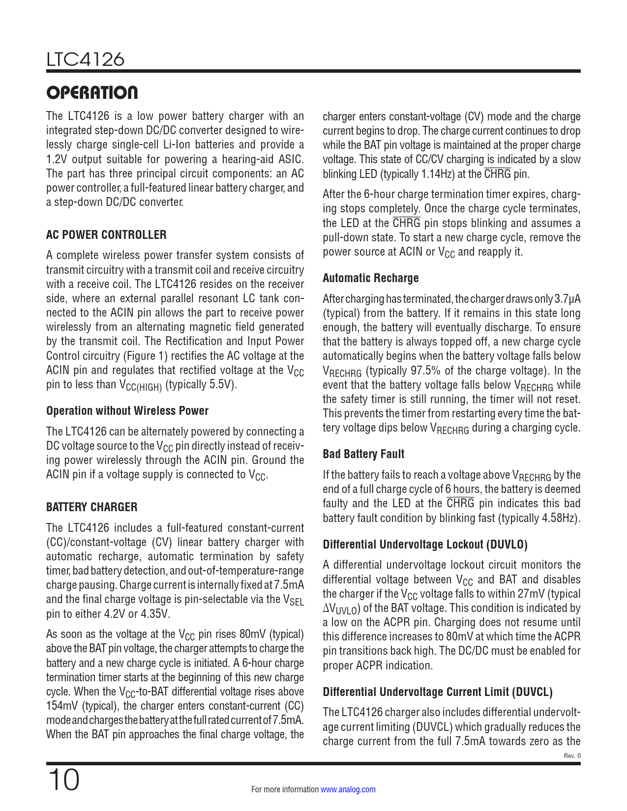 The LTC4126 is a low power battery charger with an charger enters constant-voltage (CV) mode and the charge integrated step-down DC/DC converter designed to wire- current begins to drop. The charge current continues to drop lessly charge single-cell Li-Ion batteries and provide a while the BAT pin voltage is maintained at the proper charge 1.2V output suitable for powering a hearing-aid ASIC. voltage. This state of CC/CV charging is indicated by a slow The part has three principal circuit components: an AC blinking LED (typically 1.14Hz) at the CHRG pin. power controller, a full-featured linear battery charger, and After the 6-hour charge termination timer expires, charg- a step-down DC/DC converter. ing stops completely. Once the charge cycle terminates, the LED at the CHRG pin stops blinking and assumes a