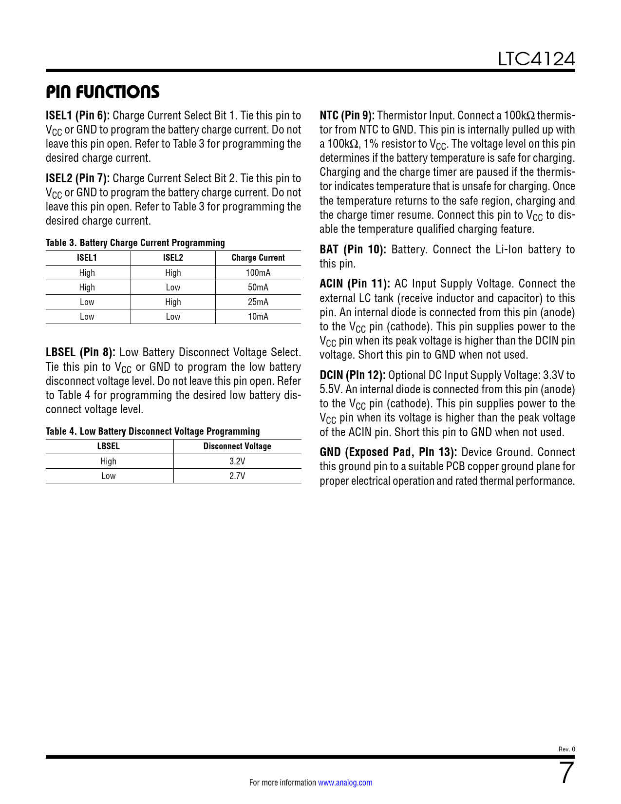 PIN FUNCTIONS ISEL1 (Pin 6):. NTC (Pin 9):. ISEL2 (Pin 7):. Table 3. Battery Charge Current Programming. BAT (Pin 10):. ISEL1