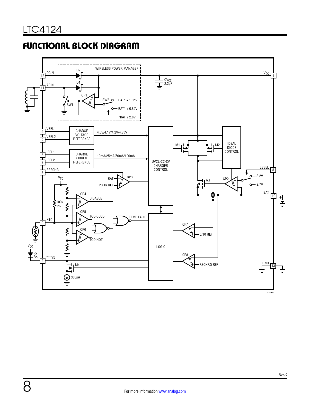 WIRELESS POWER MANAGER D2 DCIN V 12 CC 1 CVCC D1 2.2µF ACIN 11 CP1 + SW2 BAT* + 1.05V SW1 – BAT* + 0.85V *BAT ≥ 2.8V VSEL1 4 CHARGE 4.0V/4.1V/4.2V/4.35V VOLTAGE VSEL2 5 REFERENCE M1 M2 IDEAL DIODE ISEL1 CONTROL 6 CHARGE 10mA/25mA/50mA/100mA CURRENT ISEL2 7 REFERENCE UVCL-CC-CV CHARGER LBSEL PRECHG CONTROL 8 3 – V CP3 3.2V CC BAT – CP2 + M3 PCHG REF + 2.7V –CP4 BAT 10 DISABLE + 100k + 1% –CP5 TOO COLD NTC + TEMP FAULT 9 CP7 – –CP6 + + C/10 REF TOO HOT VCC LOGIC CP8 – CHRG 2 + RECHRG REF GND M4 13 300µA 4124 BD Rev. 0 8 For more information www.analog.com Document Outline Features Applications Typical Application Description Absolute Maximum Ratings Order Information Pin Configuration Electrical Characteristics Typical Performance Characteristics Pin Functions Functional Block Diagram Operation Applications Information Typical Applications Package Description Typical Application Related Parts