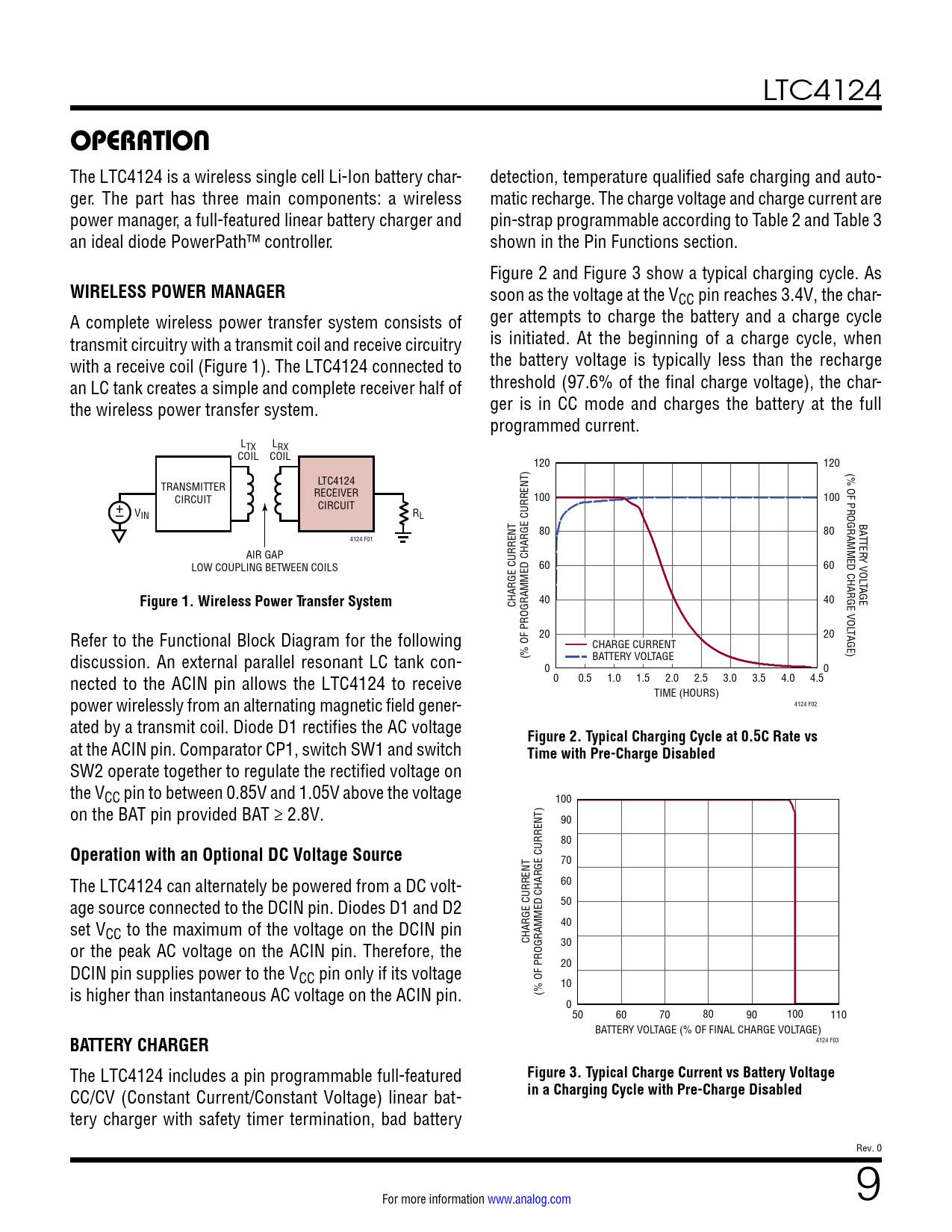 link to page 9 link to page 8 link to page 6 link to page 7 link to page 6 link to page 9 link to page 9 LTC4124 OPERATION The LTC4124 is a wireless single cell Li-Ion battery char- detection, temperature qualified safe charging and auto- ger. The part has three main components: a wireless matic recharge. The charge voltage and charge current are power manager, a full-featured linear battery charger and pin-strap programmable according to Table 2 and Table 3 an ideal diode PowerPath™ controller. shown in the Pin Functions section. Figure 2 and Figure 3 show a typical charging cycle. As WIRELESS POWER MANAGER soon as the voltage at the VCC pin reaches 3.4V, the char- A complete wireless power transfer system consists of ger attempts to charge the battery and a charge cycle transmit circuitry with a transmit coil and receive circuitry is initiated. At the beginning of a charge cycle, when with a receive coil (Figure 1). The LTC4124 connected to the battery voltage is typically less than the recharge an LC tank creates a simple and complete receiver half of threshold (97.6% of the final charge voltage), the char- the wireless power transfer system. ger is in CC mode and charges the battery at the full programmed current. LTX LRX COIL COIL 120 120 (% OF PROGRAMMED CHARGE VOL LTC4124 TRANSMITTER RECEIVER 100 100 + CIRCUIT CIRCUIT – VIN RL BA 80 80 T 4124 F01 TER AIR GAP Y VOL LOW COUPLING BETWEEN COILS 60 60 TAGE Figure 1. Wireless Power Transfer System CHARGE CURRENT 40 40 T Refer to the Functional Block Diagram for the following 20 20 AGE) CHARGE CURRENT discussion. An external parallel resonant LC tank con- (% OF PROGRAMMED CHARGE CURRENT) BATTERY VOLTAGE 0 0 nected to the ACIN pin allows the LTC4124 to receive 0 0.5 1.0 1.5 2.0 2.5 3.0 3.5 4.0 4.5 TIME (HOURS) power wirelessly from an alternating magnetic field gener- 4124 F02 ated by a transmit coil. Diode D1 rectifies the AC voltage Figure 2. Typical Charging Cycle at 0.5C Rate vs at the ACIN pin. Comparator CP1, switch SW1 and switch Time with Pre-Charge Disabled SW2 operate together to regulate the rectified voltage on the VCC pin to between 0.85V and 1.05V above the voltage 100 on the BAT pin provided BAT ≥ 2.8V. 90 80 Operation with an Optional DC Voltage Source 70 The LTC4124 can alternately be powered from a DC volt- 60 age source connected to the DCIN pin. Diodes D1 and D2 50 set V 40 CC to the maximum of the voltage on the DCIN pin or the peak AC voltage on the ACIN pin. Therefore, the CHARGE CURRENT 30 DCIN pin supplies power to the V 20 CC pin only if its voltage is higher than instantaneous AC voltage on the ACIN pin. 10 (% OF PROGRAMMED CHARGE CURRENT) 050 60 70 80 90 100 110 BATTERY VOLTAGE (% OF FINAL CHARGE VOLTAGE) BATTERY CHARGER 4124 F03 The LTC4124 includes a pin programmable full-featured Figure 3. Typical Charge Current vs Battery Voltage CC/CV (Constant Current/Constant Voltage) linear bat- in a Charging Cycle with Pre-Charge Disabled tery charger with safety timer termination, bad battery Rev. 0 For more information www.analog.com 9 Document Outline Features Applications Typical Application Description Absolute Maximum Ratings Order Information Pin Configuration Electrical Characteristics Typical Performance Characteristics Pin Functions Functional Block Diagram Operation Applications Information Typical Applications Package Description Typical Application Related Parts