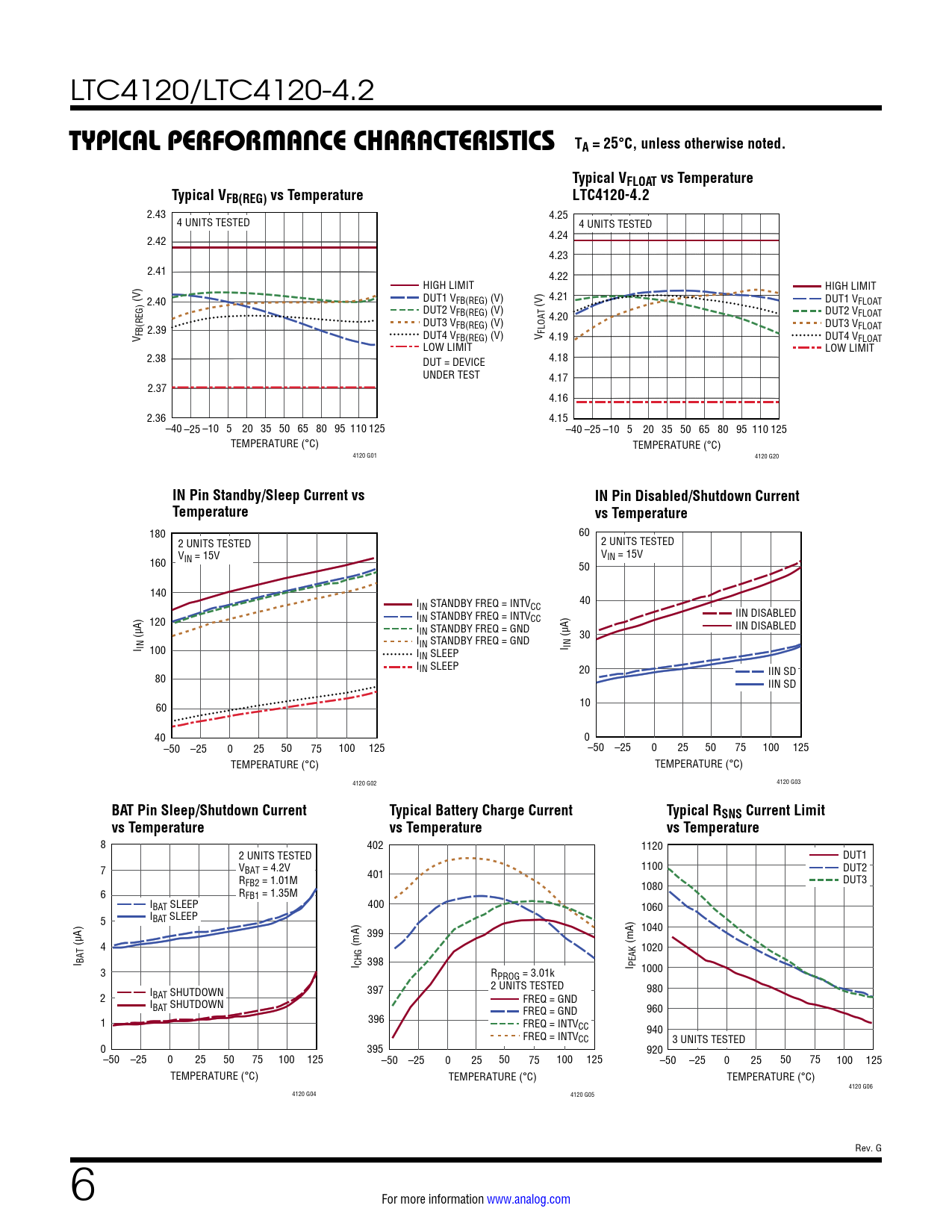 2.43 4.25 4 UNITS TESTED 4 UNITS TESTED 2.42 4.24 4.23 2.41 4.22 HIGH LIMIT HIGH LIMIT (V) 2.40 DUT1 VFB(REG) (V) 4.21 DUT1 VFLOAT DUT2 V (V) FB(REG) (V) DUT2 VFLOAT DUT3 V 4.20 DUT3 V 2.39 FB(REG) (V) FLOAT V FB(REG) DUT4 VFB(REG) (V) V FLOAT 4.19 DUT4 VFLOAT LOW LIMIT LOW LIMIT 2.38 DUT = DEVICE 4.18 UNDER TEST 4.17 2.37 4.16 2.36 4.15 –40 –25 –10 5 20 35 50 65 80 95 110 125 –40 –25 –10 5 20 35 50 65 80 95 110 125 TEMPERATURE (°C) TEMPERATURE (°C) 4120 G01 4120 G20