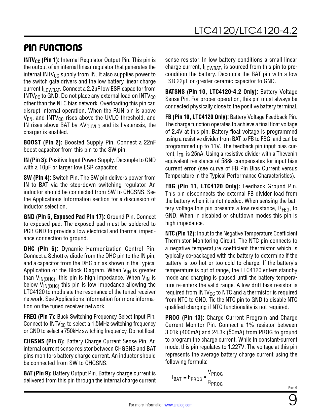 link to page 19 link to page 32 link to page 32 link to page 10 link to page 19 link to page 6 LTC4120/LTC4120-4.2 PIN FUNCTIONS INTVCC (Pin 1): Internal Regulator Output Pin. This pin is sense resistor. In low battery conditions a small linear the output of an internal linear regulator that generates the charge current, ILOWBAT, is sourced from this pin to pre- internal INTVCC supply from IN. It also supplies power to condition the battery. Decouple the BAT pin with a low the switch gate drivers and the low battery linear charge ESR 22µF or greater ceramic capacitor to GND. current ILOWBAT. Connect a 2.2µF low ESR capacitor from BATSNS (Pin 10, LTC4120-4.2 Only): Battery Voltage INTVCC to GND. Do not place any external load on INTVCC Sense Pin. For proper operation, this pin must always be other than the NTC bias network. Overloading this pin can connected physically close to the positive battery terminal. disrupt internal operation. When the RUN pin is above VEN, and INTVCC rises above the UVLO threshold, and FB (Pin 10, LTC4120 Only): Battery Voltage Feedback Pin. IN rises above BAT by ∆VDUVLO and its hysteresis, the The charge function operates to achieve a final float voltage charger is enabled. of 2.4V at this pin. Battery float voltage is programmed BOOST (Pin 2): Boosted Supply Pin. Connect a 22nF using a resistive divider from BAT to FB to FBG, and can be boost capacitor from this pin to the SW pin. programmed up to 11V. The feedback pin input bias cur- rent, IFB, is 25nA. Using a resistive divider with a Thevenin IN (Pin 3): Positive Input Power Supply. Decouple to GND equivalent resistance of 588k compensates for input bias with a 10µF or larger low ESR capacitor. current error (see curve of FB Pin Bias Current versus SW (Pin 4): Switch Pin. The SW pin delivers power from Temperature in the Typical Performance Characteristics). IN to BAT via the step-down switching regulator. An FBG (Pin 11, LTC4120 Only): Feedback Ground Pin. inductor should be connected from SW to CHGSNS. See This pin disconnects the external FB divider load from the Applications Information section for a discussion of the battery when it is not needed. When sensing the bat- inductor selection. tery voltage this pin presents a low resistance, RFBG, to GND (Pin 5, Exposed Pad Pin 17): Ground Pin. Connect GND. When in disabled or shutdown modes this pin is to exposed pad. The exposed pad must be soldered to high impedance. PCB GND to provide a low electrical and thermal imped- NTC (Pin 12): Input to the Negative Temperature Coefficient ance connection to ground. Thermistor Monitoring Circuit. The NTC pin connects to DHC (Pin 6): Dynamic Harmonization Control Pin. a negative temperature coefficient thermistor which is Connect a Schottky diode from the DHC pin to the IN pin, typically co-packaged with the battery to determine if the and a capacitor from the DHC pin as shown in the Typical battery is too hot or too cold to charge. If the battery’s Application or the Block Diagram. When VIN is greater temperature is out of range, the LTC4120 enters standby than VIN(DHC), this pin is high impedance. When VIN is mode and charging is paused until the battery tempera- below VIN(DHC) this pin is low impedance allowing the ture re-enters the valid range. A low drift bias resistor is LTC4120 to modulate the resonance of the tuned receiver required from INTVCC to NTC and a thermistor is required network. See Applications Information for more informa- from NTC to GND. Tie the NTC pin to GND to disable NTC tion on the tuned receiver network. qualified charging if NTC functionality is not required. FREQ (Pin 7): Buck Switching Frequency Select Input Pin. PROG (Pin 13): Charge Current Program and Charge Connect to INTVCC to select a 1.5MHz switching frequency Current Monitor Pin. Connect a 1% resistor between or GND to select a 750kHz switching frequency. Do not float. 3.01k (400mA) and 24.3k (50mA) from PROG to ground CHGSNS (Pin 8): Battery Charge Current Sense Pin. An to program the charge current. While in constant-current internal current sense resistor between CHGSNS and BAT mode, this pin regulates to 1.227V. The voltage at this pin pins monitors battery charge current. An inductor should represents the average battery charge current using the be connected from SW to CHGSNS. following formula: BAT (Pin 9): Battery Output Pin. Battery charge current is VPROG delivered from this pin through the internal charge current IBAT = hPROG • RPROG Rev. G For more information www.analog.com 9 Document Outline Features Applications Typical Application Description Absolute Maximum Ratings Pin Configuration Order Information Electrical Characteristics Typical Performance Characteristics Pin Functions Block Diagram Test Circuit Operation Applications Information Package Description Revision History Typical Application Related Parts