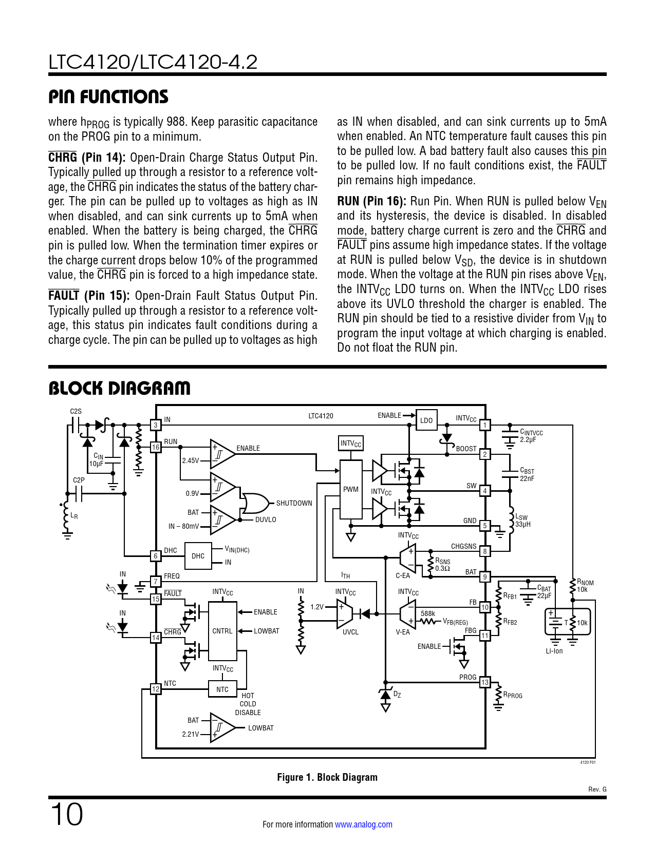 LTC4120/LTC4120-4.2 PIN FUNCTIONS where hPROG is typically 988. Keep parasitic capacitance as IN when disabled, and can sink currents up to 5mA on the PROG pin to a minimum. when enabled. An NTC temperature fault causes this pin CHRG (Pin 14): Open-Drain Charge Status Output Pin. to be pulled low. A bad battery fault also causes this pin Typically pulled up through a resistor to a reference volt- to be pulled low. If no fault conditions exist, the FAULT age, the CHRG pin indicates the status of the battery char- pin remains high impedance. ger. The pin can be pulled up to voltages as high as IN RUN (Pin 16): Run Pin. When RUN is pulled below VEN when disabled, and can sink currents up to 5mA when and its hysteresis, the device is disabled. In disabled enabled. When the battery is being charged, the CHRG mode, battery charge current is zero and the CHRG and pin is pulled low. When the termination timer expires or FAULT pins assume high impedance states. If the voltage the charge current drops below 10% of the programmed at RUN is pulled below VSD, the device is in shutdown value, the CHRG pin is forced to a high impedance state. mode. When the voltage at the RUN pin rises above VEN, FAULT (Pin 15): Open-Drain Fault Status Output Pin. the INTVCC LDO turns on. When the INTVCC LDO rises Typically pulled up through a resistor to a reference volt- above its UVLO threshold the charger is enabled. The age, this status pin indicates fault conditions during a RUN pin should be tied to a resistive divider from VIN to charge cycle. The pin can be pulled up to voltages as high program the input voltage at which charging is enabled. Do not float the RUN pin. BLOCK DIAGRAM C2S LTC4120 ENABLE IN INTV LDO CC 3 1 CINTVCC RUN INTV 2.2µF CC 16 + ENABLE BOOST C 2 IN 10µF 2.45V – CBST C2P + 22nF PWM SW INTV 0.9V CC 4 – • SHUTDOWN L BAT + R LSW DUVLO GND IN – 80mV – 5 33µH INTVCC CHGSNS V DHC IN(DHC) + 8 6 DHC R IN SNS – 0.3Ω IN FREQ I BAT TH C-EA 9 7 RNOM INTV C FAULT CC IN INTVCC BAT INTV 10k CC RFB1 22µF 15 FB 1.2V + – 10 IN ENABLE 588k + – + V R FB(REG) FB2 T 10k CHRG CNTRL LOWBAT UVCL V-EA FBG 11 14 ENABLE Li-Ion INTVCC PROG NTC 13 12 NTC HOT DZ RPROG COLD DISABLE – BAT + LOWBAT 2.21V 4120 F01 Figure 1. Block Diagram Rev. G 10 For more information www.analog.com Document Outline Features Applications Typical Application Description Absolute Maximum Ratings Pin Configuration Order Information Electrical Characteristics Typical Performance Characteristics Pin Functions Block Diagram Test Circuit Operation Applications Information Package Description Revision History Typical Application Related Parts