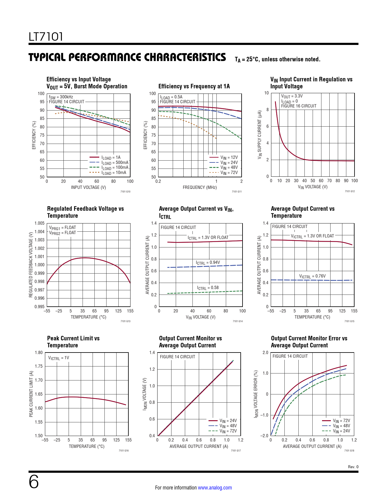 1.80 1.4 2.0 V FIGURE 14 CIRCUIT ICTRL = 1V FIGURE 14 CIRCUIT 1.75 1.2 1.0 1.70 1.0 1.65 TAGE (V) 0 VOL 0.8 TAGE ERROR (%) 1.60 I MON VOL PEAK CURRENT LIMIT (A) –1.0 0.6 I MON 1.55 VIN = 24V VIN = 72V VIN = 48V VIN = 48V VIN = 72V VIN = 24V 1.50 0.4 –2.0 –55 –25 5 35 65 95 125 155 0 0.2 0.4 0.6 0.8 1.0 1.2 0 0.2 0.4 0.6 0.8 1.0 1.2 TEMPERATURE (°C) AVERAGE OUTPUT CURRENT (A) AVERAGE OUTPUT CURRENT (A) 7101 G16 7101 G17 7101 G18 Rev. 0 6 For more information www.analog.com Document Outline Features Applications Typical Application Description Absolute Maximum Ratings Order Information Pin Configuration Electrical Characteristics Typical Performance Characteristics Pin Functions Functional Diagram Operation Applications Information Typical Applications Package Description Typical Application Related Parts