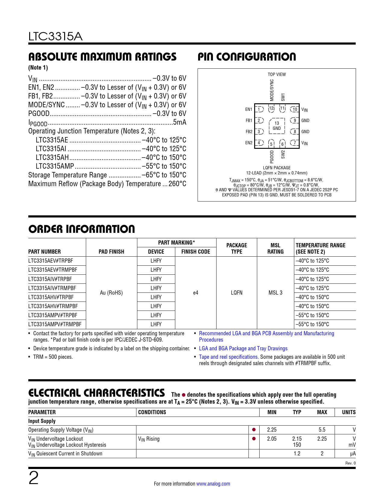 LTC3315A ABSOLUTE MAXIMUM RATINGSPIN CONFIGURATION(Note 1) V TOP VIEW IN ... –0.3V to 6V EN1, EN2 .. –0.3V to Lesser of (VIN + 0.3V) or 6V FB1, FB2 ... –0.3V to Lesser of (VIN + 0.3V) or 6V MODE/SYNC SW1 MODE/SYNC .. –0.3V to Lesser of (VIN + 0.3V) or 6V 12 11 PGOOD ... –0.3V to 6V EN1 1 10 VIN I FB1 2 9 GND PGOOD ..5mA 13 Operating Junction Temperature (Notes 2, 3): GND FB2 3 8 GND LTC3315AE .. –40°C to 125°C EN2 4 7 V 5 6 IN LTC3315AI ... –40°C to 125°C LTC3315AH .. –40°C to 150°C SW2 LTC3315AMP ... –55°C to 150°C PGOOD LQFN PACKAGE Storage Temperature Range .. –65°C to 150°C 12-LEAD (2mm × 2mm × 0.74mm) Maximum Reflow (Package Body) Temperature ...260°C TJMAX = 150°C, θJA = 51°C/W, θJCBOTTOM = 8.6°C/W, θJCTOP = 80°C/W, θJB = 12°C/W, ΨJT = 0.8°C/W, θ AND Ψ VALUES DETERMINED PER JESD51-7 ON A JEDEC 2S2P PC EXPOSED PAD (PIN 13) IS GND, MUST BE SOLDERED TO PCB ORDER INFORMATIONPART MARKING*PACKAGEMSLTEMPERATURE RANGEPART NUMBERPAD FINISHDEVICEFINISH CODETYPERATING(SEE NOTE 2) LTC3315AEV#TRPBF LHFY –40°C to 125°C LTC3315AEV#TRMPBF LHFY –40°C to 125°C LTC3315AIV#TRPBF LHFY –40°C to 125°C LTC3315AIV#TRMPBF LHFY –40°C to 125°C Au (RoHS) e4 LQFN MSL 3 LTC3315AHV#TRPBF LHFY –40°C to 150°C LTC3315AHV#TRMPBF LHFY –40°C to 150°C LTC3315AMPV#TRPBF LHFY –55°C to 150°C LTC3315AMPV#TRMPBF LHFY –55°C to 150°C • Contact the factory for parts specified with wider operating temperature • Recommended LGA and BGA PCB Assembly and Manufacturing ranges. *Pad or ball finish code is per IPC/JEDEC J-STD-609. Procedures • Device temperature grade is indicated by a label on the shipping container. • LGA and BGA Package and Tray Drawings • TRM = 500 pieces. • Tape and reel specifications. Some packages are available in 500 unit reels through designated sales channels with #TRMPBF suffix. ELECTRICAL CHARACTERISTICSThe l denotes the specifications which apply over the full operatingjunction temperature range, otherwise specifications are at TA = 25°C (Notes 2, 3). VIN = 3.3V unless otherwise specified. PARAMETERCONDITIONSMINTYPMAXUNITSInput Supply Operating Supply Voltage (VIN) l 2.25 5.5 V VIN Undervoltage Lockout VIN Rising l 2.05 2.15 2.25 V VIN Undervoltage Lockout Hysteresis 150 mV VIN Quiescent Current in Shutdown 1.2 2 µA Rev. 0 2 For more information www.analog.com Document Outline Features Applications Typical Application Description Absolute Maximum Ratings Order Information Electrical Characteristics Pin Configuration Typical Performance Characteristics Pin Functions Block Diagram Operation Applications Information Typical Applications Package Description Typical Application Related Parts