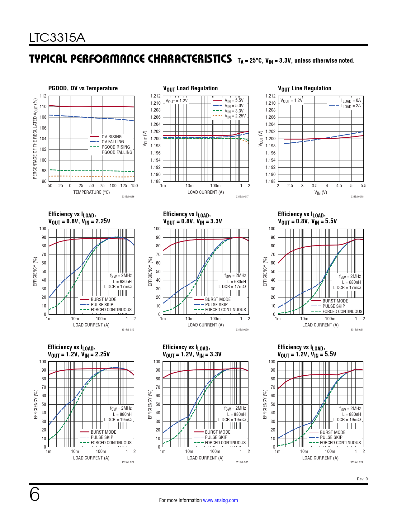 112 1.212 1.212 V VOUT = 1.2V ILOAD = 0A (%) OUT = 1.2V VIN = 5.5V 1.210 1.210 110 VIN = 5.0V ILOAD = 2A OUT 1.208 VIN = 3.3V 1.208 108 V 1.206 IN = 2.25V 1.206 TED V 1.204 1.204 106 1.202 1.202 OV RISING (V) (V) 104 1.200 1.200 OV FALLING PGOOD RISING V OUT 1.198 V OUT 1.198 102 PGOOD FALLING 1.196 1.196 AGE OF THE REGULA 100 1.194 1.194 1.192 1.192 98 1.190 1.190 PERCENT 96 1.188 1.188 –50 –25 0 25 50 75 100 125 150 1m 10m 100m 1 2 2 2.5 3 3.5 4 4.5 5 5.5 TEMPERATURE (°C) LOAD CURRENT (A) VIN (V) 3315ab G16 3315ab G17 3315ab G18