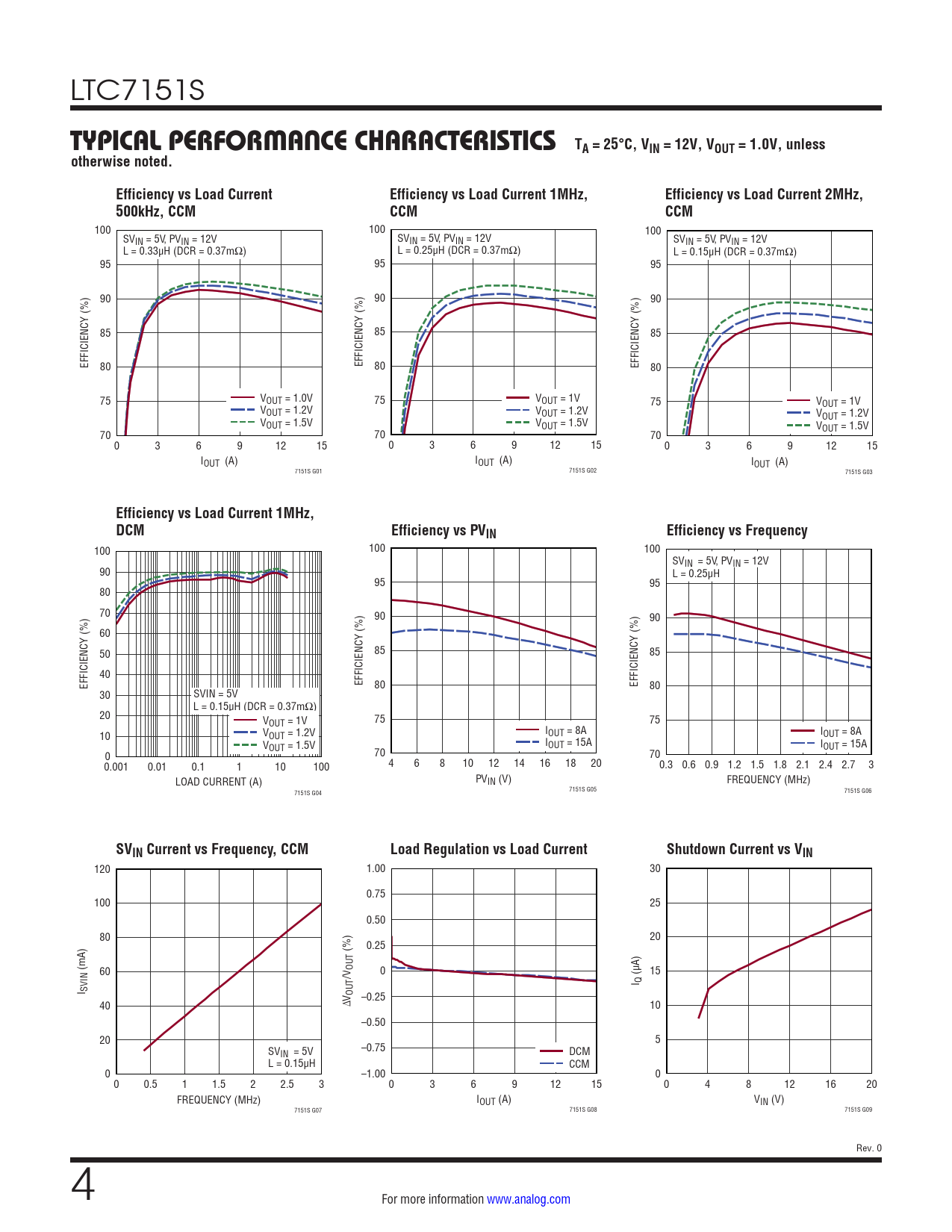 120 1.00 30 0.75 100 25 0.50 80 20 0.25 (%) (mA) 60 OUT 0 /V (µA) 15 I Q I SVIN OUT –0.25 40 ∆V 10 –0.50 20 5 SV –0.75 IN = 5V DCM L = 0.15µH CCM 0 –1.00 0 0 0.5 1 1.5 2 2.5 3 0 3 6 9 12 15 0 4 8 12 16 20 FREQUENCY (MHz) IOUT (A) VIN (V) 7151S G07 7151S G08 7151S G09 Rev. 0 4 For more information www.analog.com Document Outline Features Applications Typical Application Description Absolute Maximum Ratings Order Information Electrical Characteristics Pin Configuration Electrical Characteristics Typical Performance Characteristics Pin Functions Block Diagram Operation Typical Applications Package Photo Typical Application Related Parts