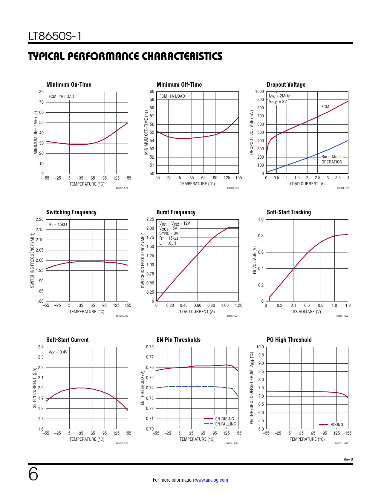 2.20 2.25 1.0 RT = 15kΩ VIN1 = VIN2 = 12V 2.15 2.00 VOUT = 5V SYNC = 0V 0.8 2.10 1.75 RT = 15kΩ L = 1.0µH 1.50 2.05 0.6 1.25 2.00 TAGE (V) 1.00 1.95 0.4 0.75 FB VOL 1.90 0.50 SWITCHING FREQUENCY (MHz) SWITCHING FREQUENCY (MHz) 0.2 1.85 0.25 1.80 0 0 –55 –25 5 35 65 95 125 155 0 0.20 0.40 0.60 0.80 1.00 1.20 0 0.2 0.4 0.6 0.8 1.0 1.2 TEMPERATURE (°C) LOAD CURRENT (A) SS VOLTAGE (V) 8650s1 G20 8650s1 G21 8650s1 G22