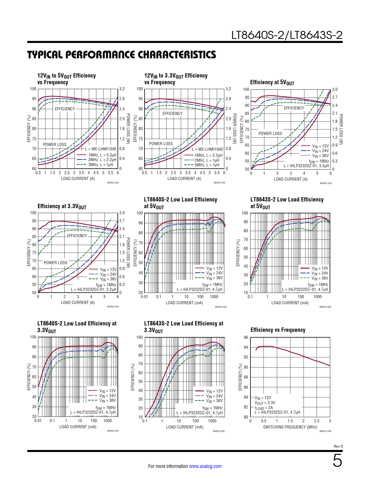 TYPICAL PERFORMANCE CHARACTERISTICS. 12VIN to 5VOUT Efficiency. 12VIN to 3.3VOUT Efficiency. vs Frequency. Efficiency at 5VOUT