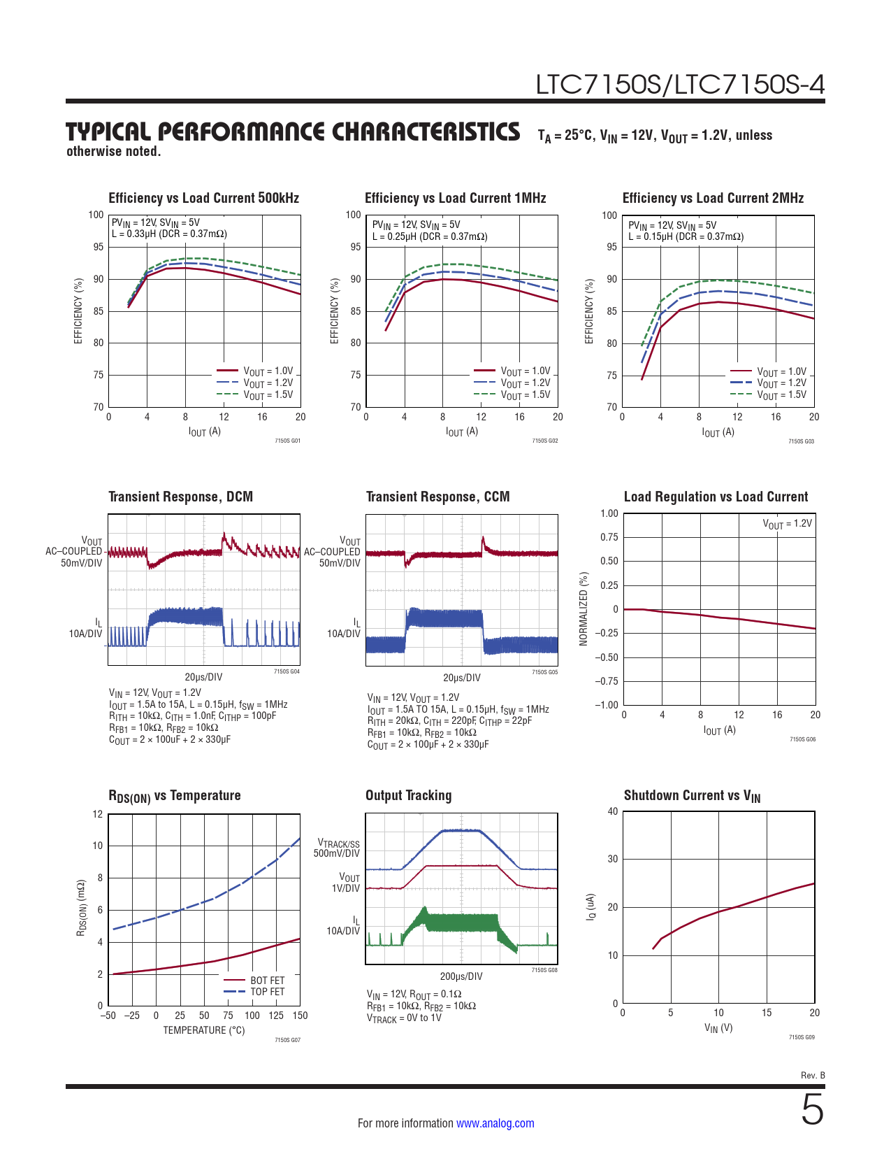 12 40 10 VTRACK/SS 500mV/DIV 30 8 VOUT Ω) 1V/DIV (m 6 (uA) 20 IL I Q R DS(ON) 10A/DIV 4 10 2 7150S G08 BOT FET 200µs/DIV TOP FET VIN = 12V, ROUT = 0.1Ω 0 RFB1 = 10kΩ, RFB2 = 10kΩ 0 –50 –25 0 25 50 75 100 125 150 V 0 5 10 15 20 TRACK = 0V to 1V TEMPERATURE (°C) VIN (V) 7150S G07 7150S G09 Rev. B For more information www.analog.com 5 Document Outline Features Applications Typical Application Description Absolute Maximum Ratings Order Information Pin Configuration Electrical Characteristics Electrical Characteristics Typical Performance Characteristics Pin Functions Block Diagram Operation Typical Applications Package Photo Revision History Typical Application Related Parts