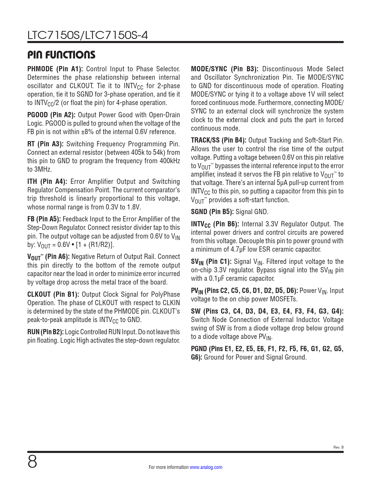 LTC7150S/LTC7150S-4 PIN FUNCTIONS PHMODE (Pin A1): Control Input to Phase Selector. MODE/SYNC (Pin B3): Discontinuous Mode Select Determines the phase relationship between internal and Oscillator Synchronization Pin. Tie MODE/SYNC oscillator and CLKOUT. Tie it to INTVCC for 2-phase to GND for discontinuous mode of operation. Floating operation, tie it to SGND for 3-phase operation, and tie it MODE/SYNC or tying it to a voltage above 1V will select to INTVCC/2 (or float the pin) for 4-phase operation. forced continuous mode. Furthermore, connecting MODE/ PGOOD (Pin A2): Output Power Good with Open-Drain SYNC to an external clock will synchronize the system Logic. PGOOD is pulled to ground when the voltage of the clock to the external clock and puts the part in forced FB pin is not within ±8% of the internal 0.6V reference. continuous mode. RT (Pin A3): Switching Frequency Programming Pin. TRACK/SS (Pin B4): Output Tracking and Soft-Start Pin. Connect an external resistor (between 405k to 54k) from Allows the user to control the rise time of the output this pin to GND to program the frequency from 400kHz voltage. Putting a voltage between 0.6V on this pin relative – to 3MHz. to VOUT bypasses the internal reference input to the error amplifier, instead it servos the FB pin relative to V – OUT to ITH (Pin A4): Error Amplifier Output and Switching that voltage. There’s an internal 5µA pull-up current from Regulator Compensation Point. The current comparator’s INTVCC to this pin, so putting a capacitor from this pin to trip threshold is linearly proportional to this voltage, V – OUT provides a soft-start function. whose normal range is from 0.3V to 1.8V. SGND (Pin B5): Signal GND. FB (Pin A5): Feedback Input to the Error Amplifier of the Step-Down Regulator. Connect resistor divider tap to this INTVCC (Pin B6): Internal 3.3V Regulator Output. The pin. The output voltage can be adjusted from 0.6V to V internal power drivers and control circuits are powered IN by: V from this voltage. Decouple this pin to power ground with OUT = 0.6V • [1 + (R1/R2)]. a minimum of 4.7µF low ESR ceramic capacitor. V–OUT (Pin A6): Negative Return of Output Rail. Connect this pin directly to the bottom of the remote output SVIN (Pin C1): Signal VIN. Filtered input voltage to the capacitor near the load in order to minimize error incurred on-chip 3.3V regulator. Bypass signal into the SVIN pin by voltage drop across the metal trace of the board. with a 0.1µF ceramic capacitor. CLKOUT (Pin B1): Output Clock Signal for PolyPhase PVIN (Pins C2, C5, C6, D1, D2, D5, D6): Power VIN. Input Operation. The phase of CLKOUT with respect to CLKIN voltage to the on chip power MOSFETs. is determined by the state of the PHMODE pin. CLKOUT’s SW (Pins C3, C4, D3, D4, E3, E4, F3, F4, G3, G4): peak-to-peak amplitude is INTVCC to GND. Switch Node Connection of External Inductor. Voltage RUN (Pin B2): Logic Controlled RUN Input. Do not leave this swing of SW is from a diode voltage drop below ground pin floating. Logic High activates the step-down regulator. to a diode voltage above PVIN. PGND (Pins E1, E2, E5, E6, F1, F2, F5, F6, G1, G2, G5,G6): Ground for Power and Signal Ground. Rev. B 8 For more information www.analog.com Document Outline Features Applications Typical Application Description Absolute Maximum Ratings Order Information Pin Configuration Electrical Characteristics Electrical Characteristics Typical Performance Characteristics Pin Functions Block Diagram Operation Typical Applications Package Photo Revision History Typical Application Related Parts