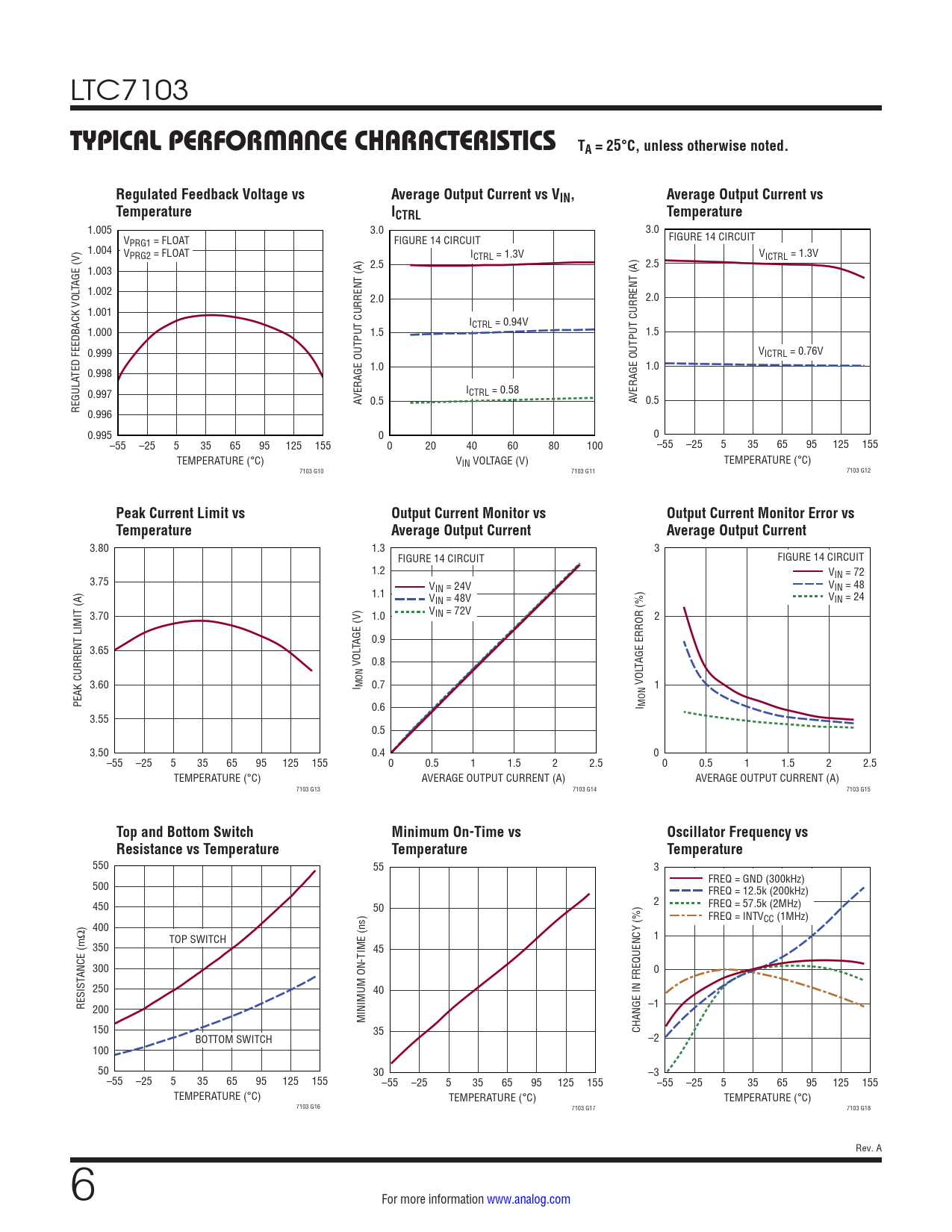 550 55 3 FREQ = GND (300kHz) 500 FREQ = 12.5k (200kHz) 450 2 50 FREQ = 57.5k (2MHz) FREQ = INTVCC (1MHz) 400 TOP SWITCH 1 350 45 300 ANCE (mΩ) 0 250 40 RESIST 200 –1 MINIMUM ON-TIME (ns) 150 35 CHANGE IN FREQUENCY (%) BOTTOM SWITCH –2 100 50 30 –3 –55 –25 5 35 65 95 125 155 –55 –25 5 35 65 95 125 155 –55 –25 5 35 65 95 125 155 TEMPERATURE (°C) TEMPERATURE (°C) TEMPERATURE (°C) 7103 G16 7103 G17 7103 G18 Rev. A 6 For more information www.analog.com Document Outline Features Applications Typical Application Description Absolute Maximum Ratings Pin Configuration Order Information Electrical Characteristics Typical Performance Characteristics Pin Functions Functional Diagram Operation Applications Information Package Description Revision History Typical Application Related Parts