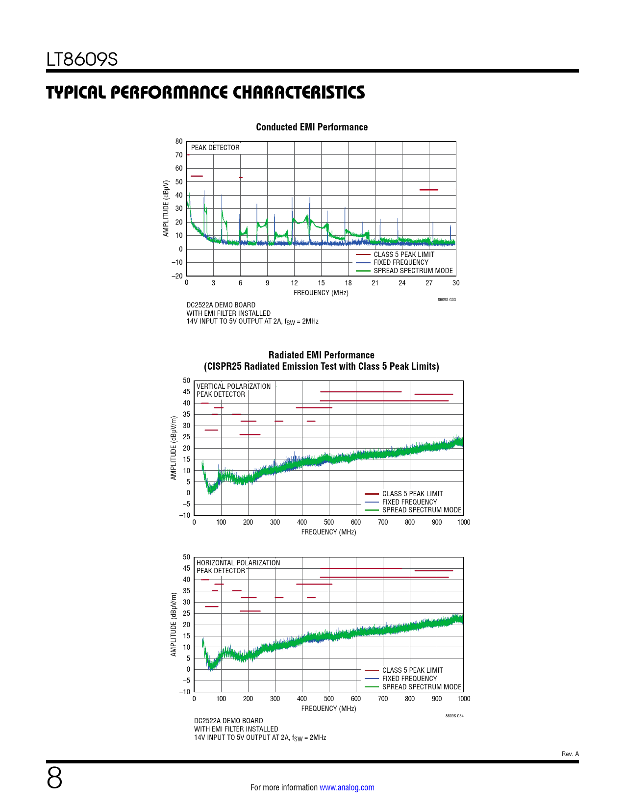 50 VERTICAL POLARIZATION 45 PEAK DETECTOR 40 35 V/m) 30 25 20 15 10 AMPLITUDE (dBµ 5 0 CLASS 5 PEAK LIMIT –5 FIXED FREQUENCY SPREAD SPECTRUM MODE –10 0 100 200 300 400 500 600 700 800 900 1000 FREQUENCY (MHz) 50 HORIZONTAL POLARIZATION 45 PEAK DETECTOR 40 35 V/m) 30 25 20 15 10 AMPLITUDE (dBµ 5 0 CLASS 5 PEAK LIMIT –5 FIXED FREQUENCY SPREAD SPECTRUM MODE –10 0 100 200 300 400 500 600 700 800 900 1000 FREQUENCY (MHz) 8609S G34 DC2522A DEMO BOARD WITH EMI FILTER INSTALLED 14V INPUT TO 5V OUTPUT AT 2A, fSW = 2MHz Rev. A 8 For more information www.analog.com Document Outline Features Applications Typical Application Description Absolute Maximum Ratings Order Information Pin Configuration Electrical Characteristics Typical Performance Characteristics Pin Functions Block Diagram Operation Applications Information Typical Applications Package Description Revision History Typical Application Related Parts