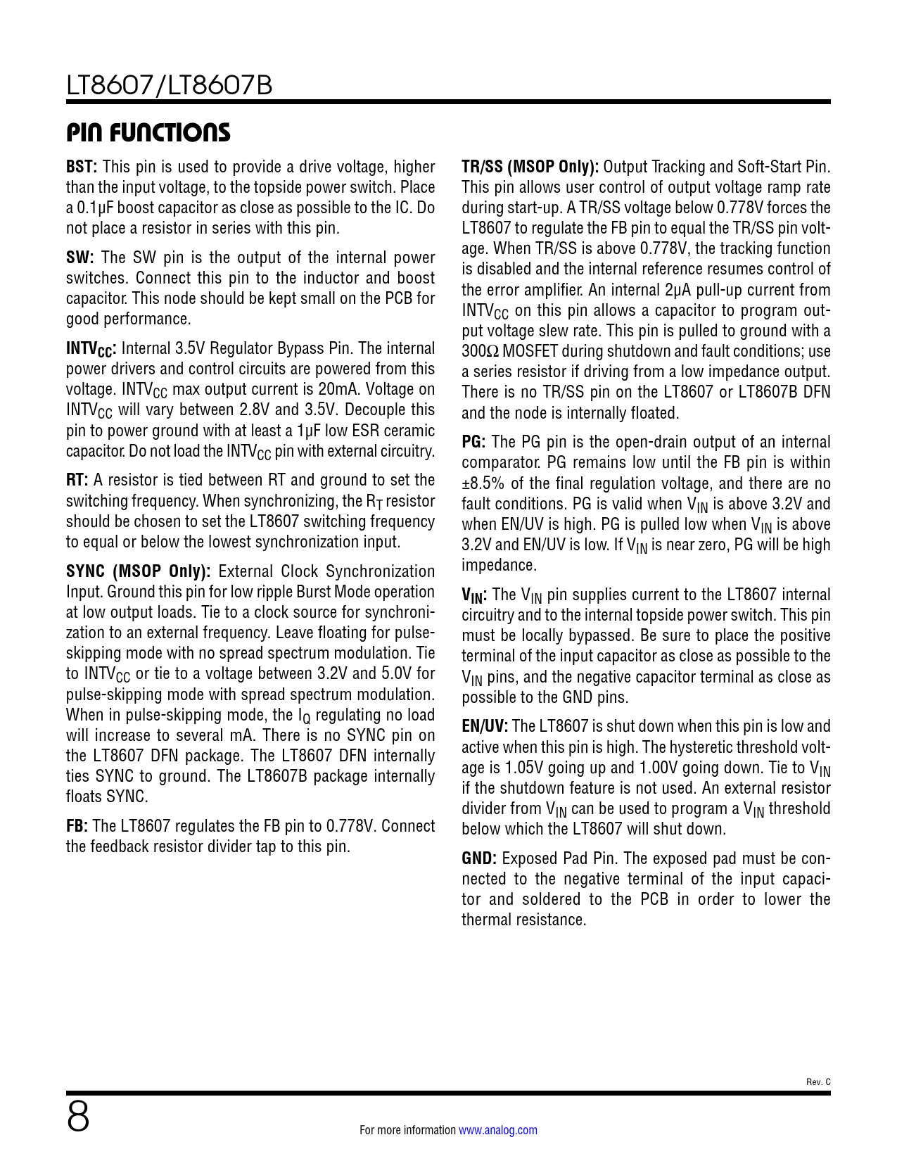 PIN FUNCTIONS BST:. TR/SS (MSOP Only):. SW:. INTVCC:. PG:. RT:. SYNC (MSOP Only):. VIN:. EN/UV:. FB:. GND:
