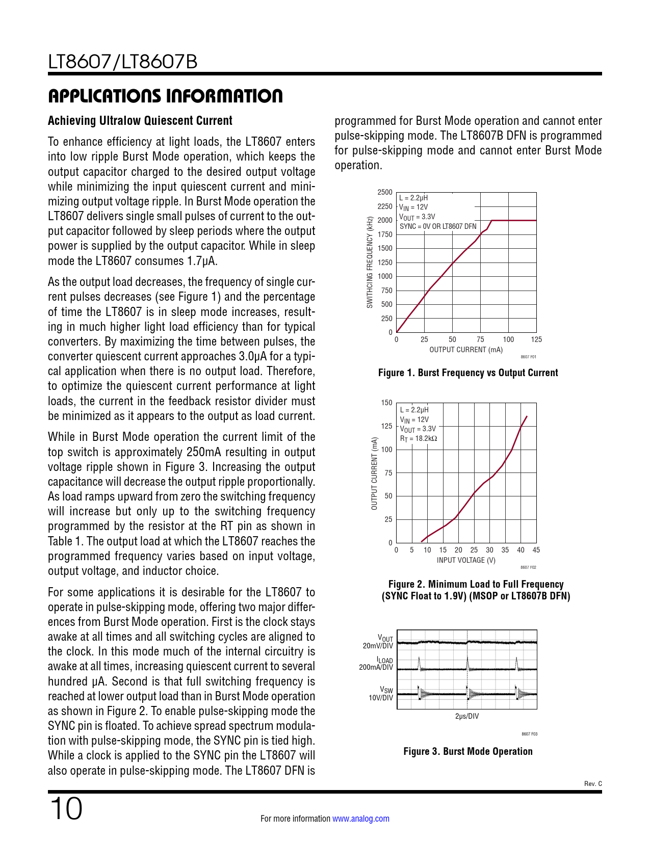 link to page 10 link to page 10 link to page 11 link to page 10 LT8607/LT8607B APPLICATIONS INFORMATION Achieving Ultralow Quiescent Current programmed for Burst Mode operation and cannot enter To enhance efficiency at light loads, the LT8607 enters pulse-skipping mode. The LT8607B DFN is programmed into low ripple Burst Mode operation, which keeps the for pulse-skipping mode and cannot enter Burst Mode output capacitor charged to the desired output voltage operation. while minimizing the input quiescent current and mini- 2500 mizing output voltage ripple. In Burst Mode operation the L = 2.2µH 2250 V LT8607 delivers single small pulses of current to the out- IN = 12V 2000 VOUT = 3.3V put capacitor followed by sleep periods where the output SYNC = 0V OR LT8607 DFN 1750 power is supplied by the output capacitor. While in sleep 1500 mode the LT8607 consumes 1.7µA. 1250 As the output load decreases, the frequency of single cur- 1000 rent pulses decreases (see Figure 1) and the percentage 750 of time the LT8607 is in sleep mode increases, result- SWITHCING FREQUENCY (kHz) 500 ing in much higher light load efficiency than for typical 250 0 converters. By maximizing the time between pulses, the 0 25 50 75 100 125 converter quiescent current approaches 3.0µA for a typi- OUTPUT CURRENT (mA) 8607 F01 cal application when there is no output load. Therefore, Figure 1. Burst Frequency vs Output Current to optimize the quiescent current performance at light loads, the current in the feedback resistor divider must 150 be minimized as it appears to the output as load current. L = 2.2µH VIN = 12V 125 V While in Burst Mode operation the current limit of the OUT = 3.3V RT = 18.2kΩ top switch is approximately 250mA resulting in output 100 voltage ripple shown in Figure 3. Increasing the output 75 capacitance will decrease the output ripple proportionally. As load ramps upward from zero the switching frequency 50 will increase but only up to the switching frequency OUTPUT CURRENT (mA) programmed by the resistor at the RT pin as shown in 25 Table 1. The output load at which the LT8607 reaches the 0 programmed frequency varies based on input voltage, 0 5 10 15 20 25 30 35 40 45 INPUT VOLTAGE (V) output voltage, and inductor choice. 8607 F02 For some applications it is desirable for the LT8607 to Figure 2. Minimum Load to Full Frequency(SYNC Float to 1.9V) (MSOP or LT8607B DFN) operate in pulse-skipping mode, offering two major differ- ences from Burst Mode operation. First is the clock stays awake at all times and all switching cycles are aligned to VOUT the clock. In this mode much of the internal circuitry is 20mV/DIV awake at all times, increasing quiescent current to several ILOAD 200mA/DIV hundred µA. Second is that full switching frequency is reached at lower output load than in Burst Mode operation VSW 10V/DIV as shown in Figure 2. To enable pulse-skipping mode the 2µs/DIV SYNC pin is floated. To achieve spread spectrum modula- tion with pulse-skipping mode, the SYNC pin is tied high. 8607 F03 While a clock is applied to the SYNC pin the LT8607 will Figure 3. Burst Mode Operation also operate in pulse-skipping mode. The LT8607 DFN is Rev. C 10 For more information www.analog.com Document Outline Features Applications Typical Application Description Absolute Maximum Ratings Order Information Electrical Characteristics Typical Performance Characteristics Pin Functions Block Diagram Operation Applications Information Typical Applications Package Description Revision History Typical Application Related Parts
