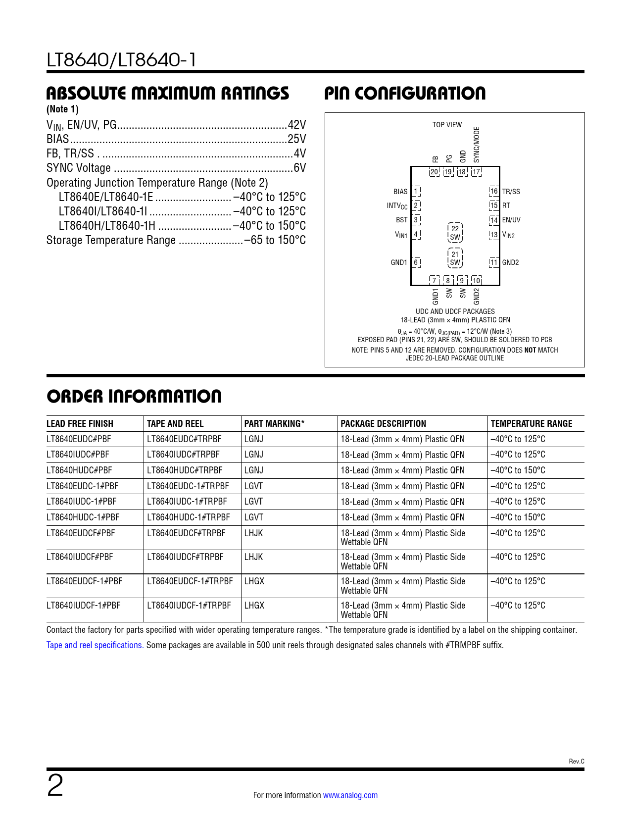 LT8640/LT8640-1 ABSOLUTE MAXIMUM RATINGSPIN CONFIGURATION(Note 1) VIN, EN/UV, PG ..42V TOP VIEW BIAS ..25V FB, TR/SS . ...4V SYNC Voltage . ..6V FB PG GND SYNC/MODE 20 19 18 17 Operating Junction Temperature Range (Note 2) LT8640E/LT8640-1E .. –40°C to 125°C BIAS 1 16 TR/SS LT8640I/LT8640-1I .. –40°C to 125°C INTVCC 2 15 RT LT8640H/LT8640-1H ... –40°C to 150°C BST 3 14 EN/UV 22 Storage Temperature Range ..–65 to 150°C VIN1 4 13 V SW IN2 21 GND1 6 SW 11 GND2 7 8 9 10 SW SW GND1 GND2 UDC AND UDCF PACKAGES 18-LEAD (3mm × 4mm) PLASTIC QFN θJA = 40°C/W, θJC(PAD) = 12°C/W (Note 3) EXPOSED PAD (PINS 21, 22) ARE SW, SHOULD BE SOLDERED TO PCB NOTE: PINS 5 AND 12 ARE REMOVED. CONFIGURATION DOES NOT MATCH JEDEC 20-LEAD PACKAGE OUTLINE ORDER INFORMATION LEAD FREE FINISHTAPE AND REELPART MARKING*PACKAGE DESCRIPTIONTEMPERATURE RANGE LT8640EUDC#PBF LT8640EUDC#TRPBF LGNJ 18-Lead (3mm × 4mm) Plastic QFN –40°C to 125°C LT8640IUDC#PBF LT8640IUDC#TRPBF LGNJ 18-Lead (3mm × 4mm) Plastic QFN –40°C to 125°C LT8640HUDC#PBF LT8640HUDC#TRPBF LGNJ 18-Lead (3mm × 4mm) Plastic QFN –40°C to 150°C LT8640EUDC-1#PBF LT8640EUDC-1#TRPBF LGVT 18-Lead (3mm × 4mm) Plastic QFN –40°C to 125°C LT8640IUDC-1#PBF LT8640IUDC-1#TRPBF LGVT 18-Lead (3mm × 4mm) Plastic QFN –40°C to 125°C LT8640HUDC-1#PBF LT8640HUDC-1#TRPBF LGVT 18-Lead (3mm × 4mm) Plastic QFN –40°C to 150°C LT8640EUDCF#PBF LT8640EUDCF#TRPBF LHJK 18-Lead (3mm × 4mm) Plastic Side –40°C to 125°C Wettable QFN LT8640IUDCF#PBF LT8640IUDCF#TRPBF LHJK 18-Lead (3mm × 4mm) Plastic Side –40°C to 125°C Wettable QFN LT8640EUDCF-1#PBF LT8640EUDCF-1#TRPBF LHGX 18-Lead (3mm × 4mm) Plastic Side –40°C to 125°C Wettable QFN LT8640IUDCF-1#PBF LT8640IUDCF-1#TRPBF LHGX 18-Lead (3mm × 4mm) Plastic Side –40°C to 125°C Wettable QFN Contact the factory for parts specified with wider operating temperature ranges. *The temperature grade is identified by a label on the shipping container. Tape and reel specifications. Some packages are available in 500 unit reels through designated sales channels with #TRMPBF suffix. Rev.C 2 For more information www.analog.com Document Outline Features Applications Typical Application Description Absolute Maximum Ratings Order Information Pin Configuration Electrical Characteristics Typical Performance Characteristics Pin Functions Block Diagram Operation Applications Information Typical Applications Package Description Revision History Typical Application Related Parts