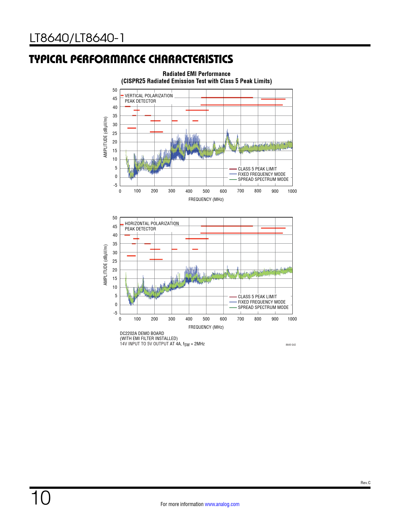 50 VERTICAL POLARIZATION 45 PEAK DETECTOR 40 35 30 25 20 15 AMPLITUDE (dBµV/m) 10 5 CLASS 5 PEAK LIMIT 0 FIXED FREQUENCY MODE SPREAD SPECTRUM MODE -5 0 100 200 300 400 500 600 700 800 900 1000 FREQUENCY (MHz) 50 HORIZONTAL POLARIZATION 45 PEAK DETECTOR 40 35 30 25 20 15 AMPLITUDE (dBµV/m) 10 5 CLASS 5 PEAK LIMIT 0 FIXED FREQUENCY MODE SPREAD SPECTRUM MODE -5 0 100 200 300 400 500 600 700 800 900 1000 FREQUENCY (MHz) DC2202A DEMO BOARD (WITH EMI FILTER INSTALLED) 14V INPUT TO 5V OUTPUT AT 4A, fSW = 2MHz 8640 G42 Rev.C 10 For more information www.analog.com Document Outline Features Applications Typical Application Description Absolute Maximum Ratings Order Information Pin Configuration Electrical Characteristics Typical Performance Characteristics Pin Functions Block Diagram Operation Applications Information Typical Applications Package Description Revision History Typical Application Related Parts