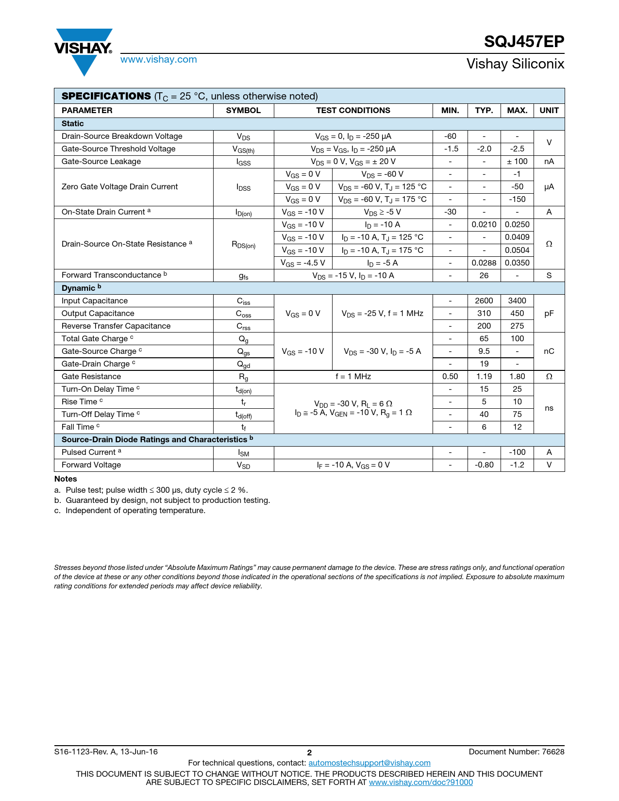 a. Pulse test; pulse width  300 μs, duty cycle  2 %. b. Guaranteed by design, not subject to production testing. c. Independent of operating temperature.     Stresses beyond those listed under “Absolute Maximum Ratings” may cause permanent damage to the device. These are stress ratings only, and functional operation of the device at these or any other conditions beyond those indicated in the operational sections of the specifications is not implied. Exposure to absolute maximum rating conditions for extended periods may affect device reliability. S16-1123-Rev. A, 13-Jun-16