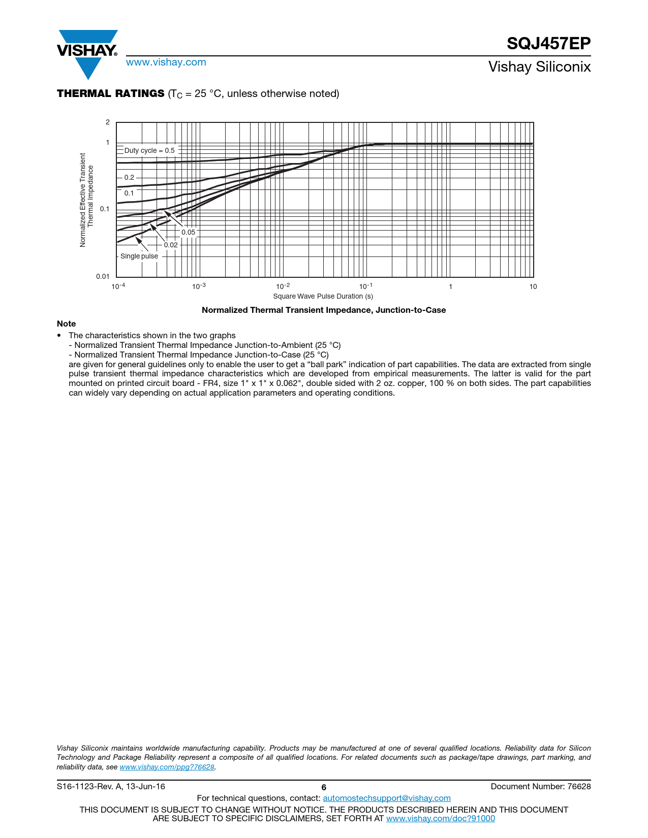 • The characteristics shown in the two graphs - Normalized Transient Thermal Impedance Junction-to-Ambient (25 °C) - Normalized Transient Thermal Impedance Junction-to-Case (25 °C) are given for general guidelines only to enable the user to get a “ball park” indication of part capabilities. The data are extracted from single pulse transient thermal impedance characteristics which are developed from empirical measurements. The latter is valid for the part mounted on printed circuit board - FR4, size 1" x 1" x 0.062", double sided with 2 oz. copper, 100 % on both sides. The part capabilities can widely vary depending on actual application parameters and operating conditions.                                     Vishay Siliconix maintains worldwide manufacturing capability. Products may be manufactured at one of several qualified locations. Reliability data for Silicon Technology and Package Reliability represent a composite of all qualified locations. For related documents such as package/tape drawings, part marking, and reliability data, see www.vishay.com/ppg?76628. S16-1123-Rev. A, 13-Jun-16