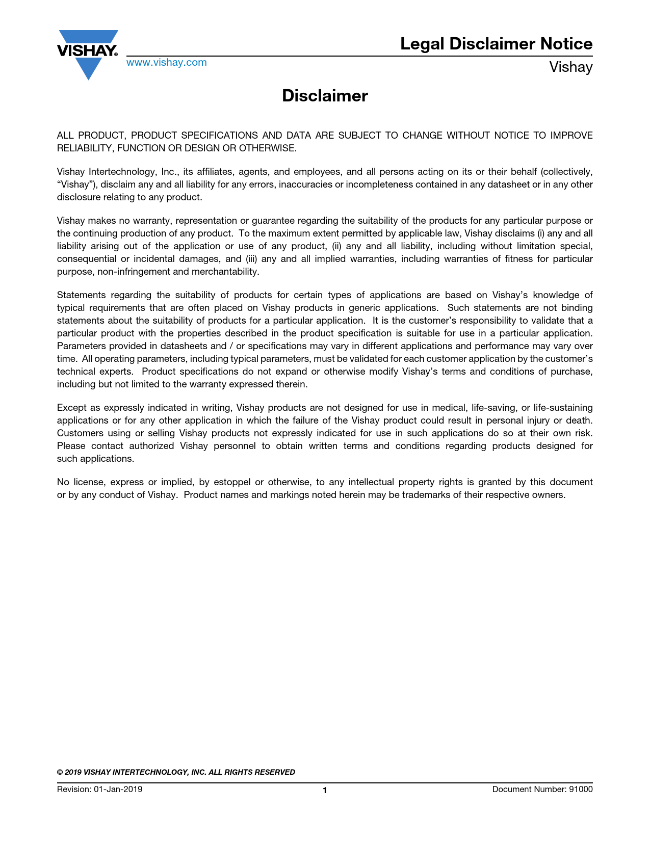 Legal Disclaimer Notice. Disclaimer. © 2019 VISHAY INTERTECHNOLOGY, INC. ALL RIGHTS RESERVED